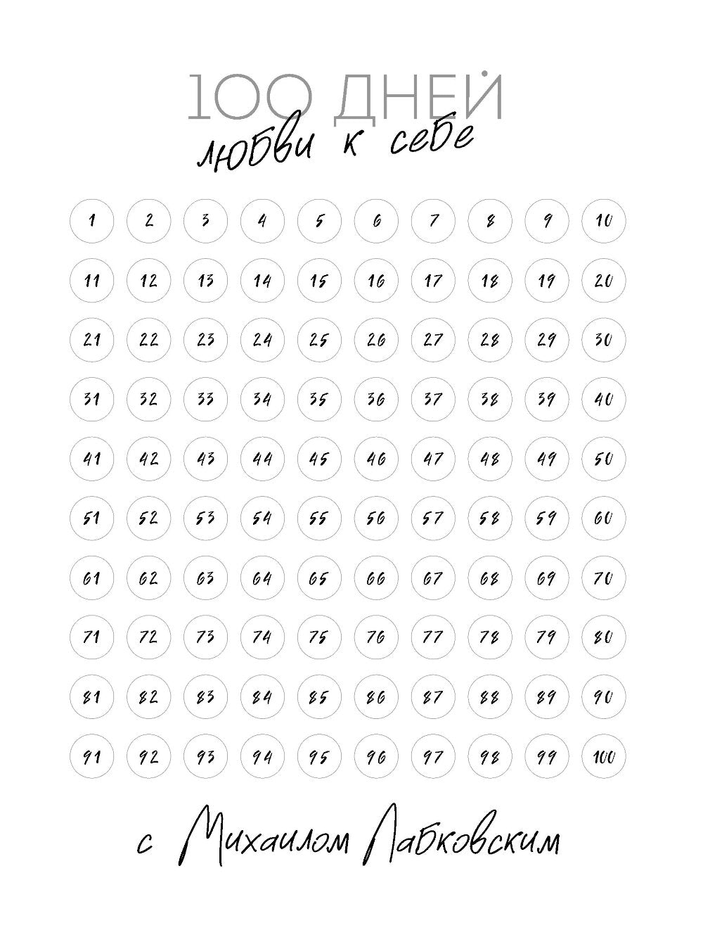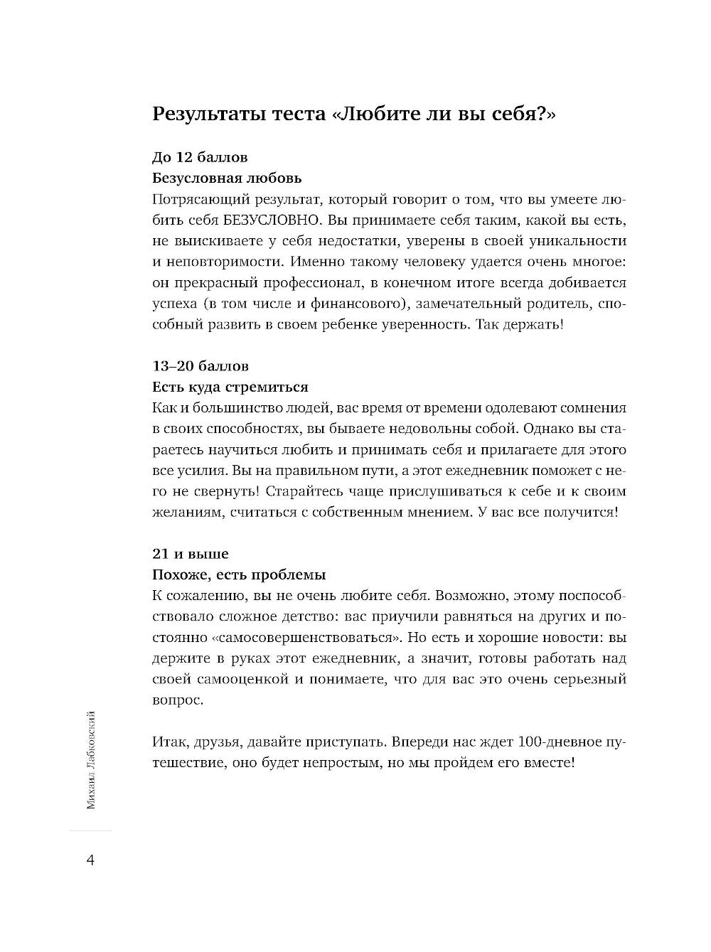 "100 jours d'expérience en septembre" — c'est l'interprète du best-seller "Хочу и буду", le psychologue populaire Michael Labkovskogo. En fait, vous avez envie de: — тексты-напутствия на каждый день — о любви к себе и самооценке; — вопросы и задания, которые помогут побороть неуверенность в себе; — комиксы с «нездоровым» и «здоровым» подходом к жизни; — привычки уверенного в себе человека; — тесты «Любите ли вы себя?» et «Нарцисс ли вы», а также тесты на невроз и самооценку; — treker для трудоголиков, чтобы разделять работу и личное время; — Un trekeur pour les « samozvancesev », qui doit s'occuper de la livraison et de la livraison en septembre. Michael Labkovskiy est le psychologue russe le plus connu selon la version du magazine Forbes. Il s'agit d'un expert dans le domaine du conseil en semi-consultation avec des stages de 35 minutes. L'auteur de la révolution a adopté la méthode « 6 jours de semaine », qui lui a été attribuée.
