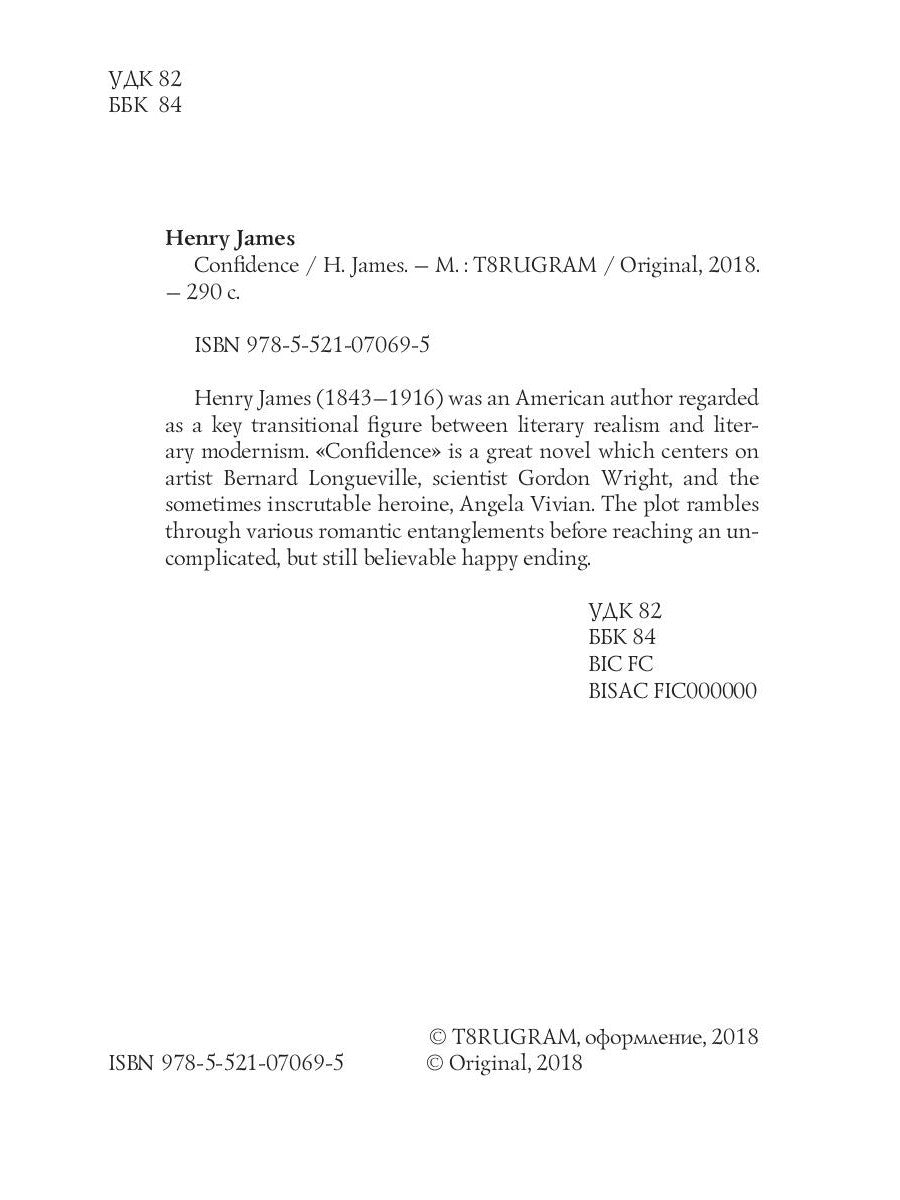 Henry James (1843-1916) était un écrivain américain considéré comme une figure clé de la transition entre le réalisme littéraire et le modernisme littéraire. « Confidence » est un roman remarquable centré sur l'artiste Bernard Longueville, le scientifique Gordon Wright et l'héroïne parfois impénétrable, Angela Vivian. L'intrigue se perd dans divers méandres amoureux avant de déboucher sur un dénouement heureux, simple mais néanmoins crédible.