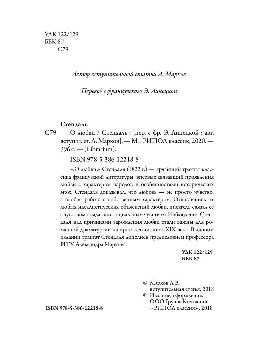 «О любви» Стендаля (1822 г.) — ярчайший трактат классика французской литературы, впервые связавший проявления любви с характером народов и особенностями исторических эпох. Stendal a été informé que ce n'est pas le cas, mais il s'agit d'un robot avec un personnage bien connu. Отказавшись от любых идеалистических объяснений любви, писатель связал ее счувством стыда как социальным чувством. L'étude de l'époque s'est déroulée dans le cadre de la période du XIXème siècle. Dans le cadre de son travail de recherche, Stendal a été nommé professeur principal, Alexander Markova.