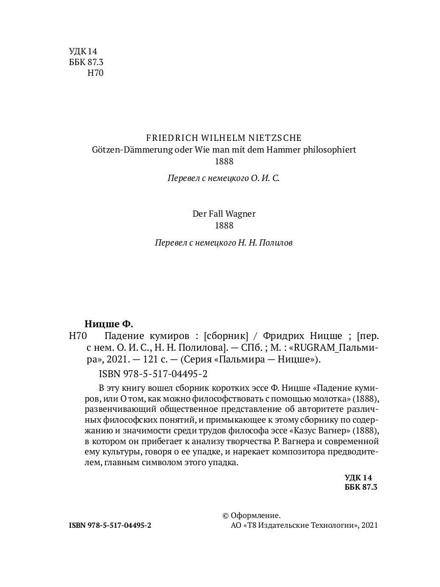В эту книгу вошел сборник коротких эссе Ф. Ницше «Падение кумиров, или О том, как можно философствовать с помощью молотка» (1888), развенчивающий общественное представление об Il s'agit d'un auteur de films professionnels et d'un auteur de l'étude de la société et de l'organisation des travaux de filiation. «Казус Вагнер» (1888), dans le cadre de l'analyse de la situation de R. Il s'agit d'une culture moderne, qui gouverne chaque mise à jour et qui cherche un compositeur avant-gardiste, ce qui signifie que c'est une mise à jour.