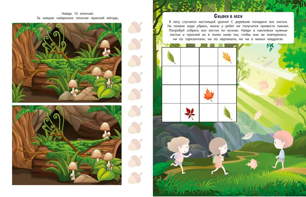 Обучающая книга-игра и более 150 ярких наклеек для любознательных озорников! Отправляйся в увлекательное путешествие! Ты узнаешь, какие бывают леса, как называются животные и птицы, которые в них обитают, найдёшь выход из запутанного лабиринта, сыграешь в лесное судоку, а ещё сможешь весело провести время с коллекцией ярких наклеек!