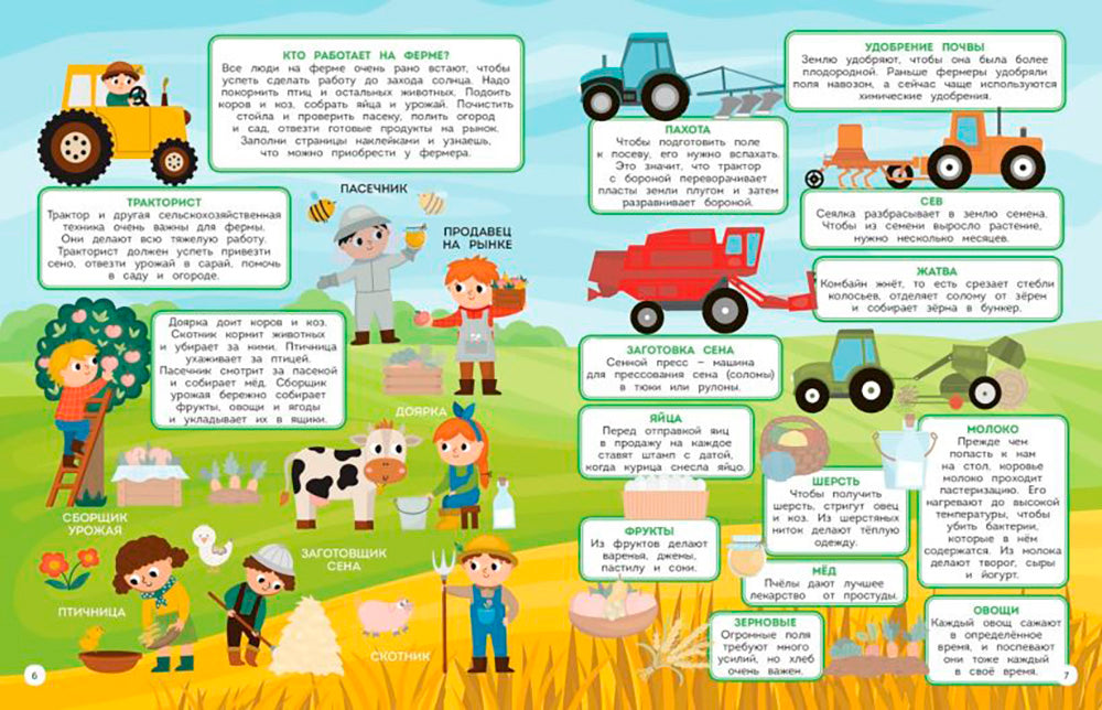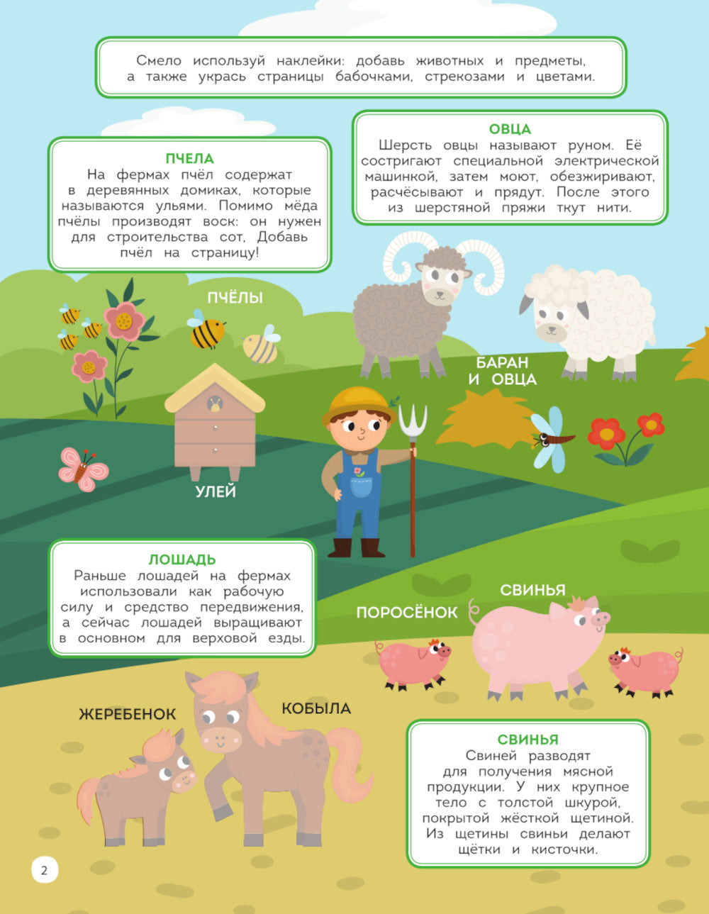 Обучающая книга-игра и более 150 ярких наклеек для любознательных озорников! Отправляйся в гости к фермеру и познакомься с самыми милыми (и полезными!) зверушками! Ты узнаешь, какие животные живут на ферме, какие машины-помощники помогают их хозяину, пройдешь запутанный лабиринт, окажешься на фермерской ярмарке... А ещё сможешь весело провести время с коллекцией ярких наклеек!