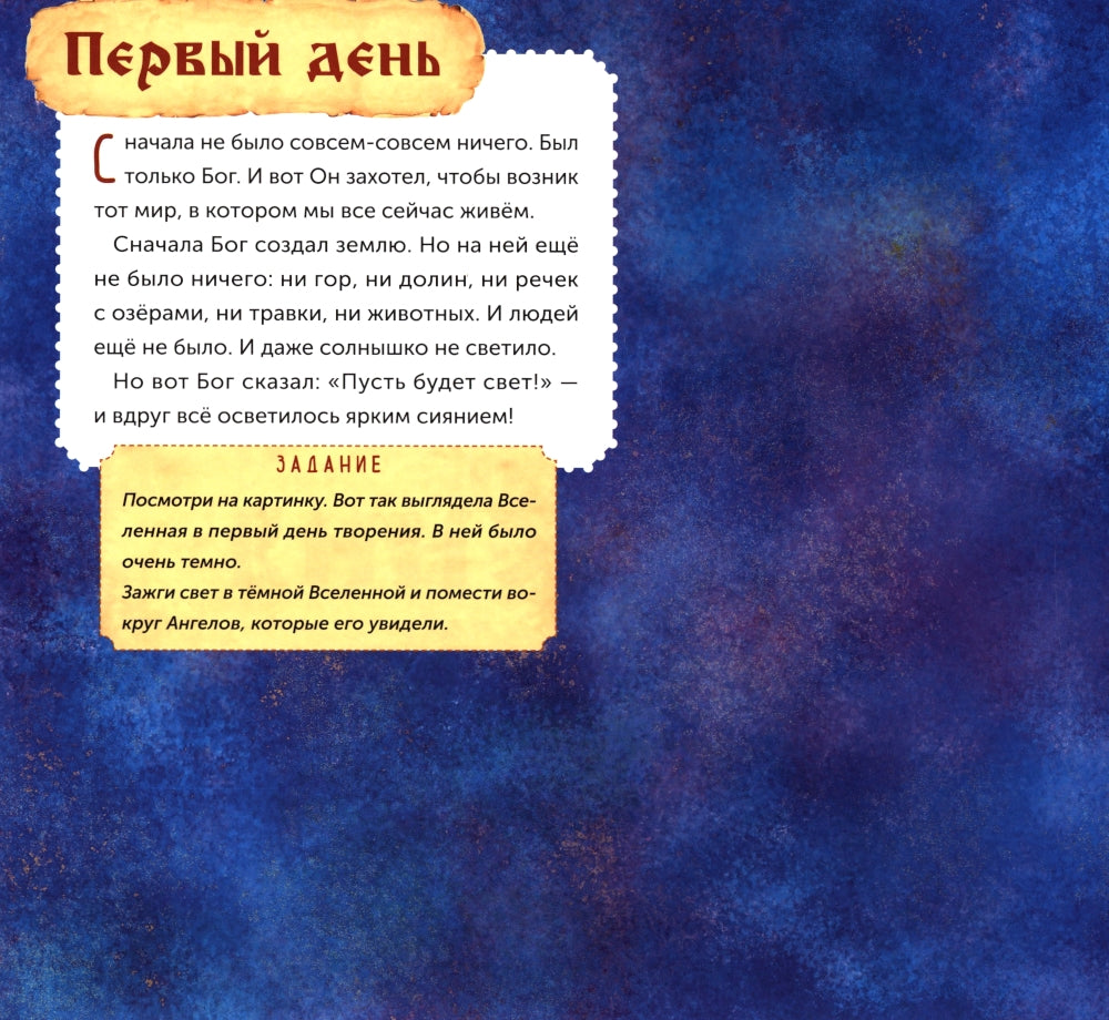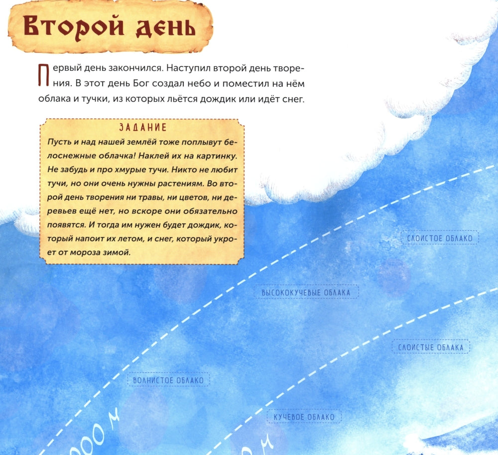 Из этой книги ребёнок узнает, как Бог сотворил наш мир и всё живое за семь дней. В книге содержится много интересных фактов о растениях, насекомых, птицах и зверях. Как из икринки получается лягушка? Как из крошечного семечка вырастает большое дерево? Откуда мы знаем о динозаврах? Почему самец павлина наряднее самочки? Чем питаются хищники? Под какими деревьями можно найти грибы? Яркие наклейки помогут ребёнку найти ответы на эти и другие важные вопросы о нашей планете и все хорошенько запомнить.