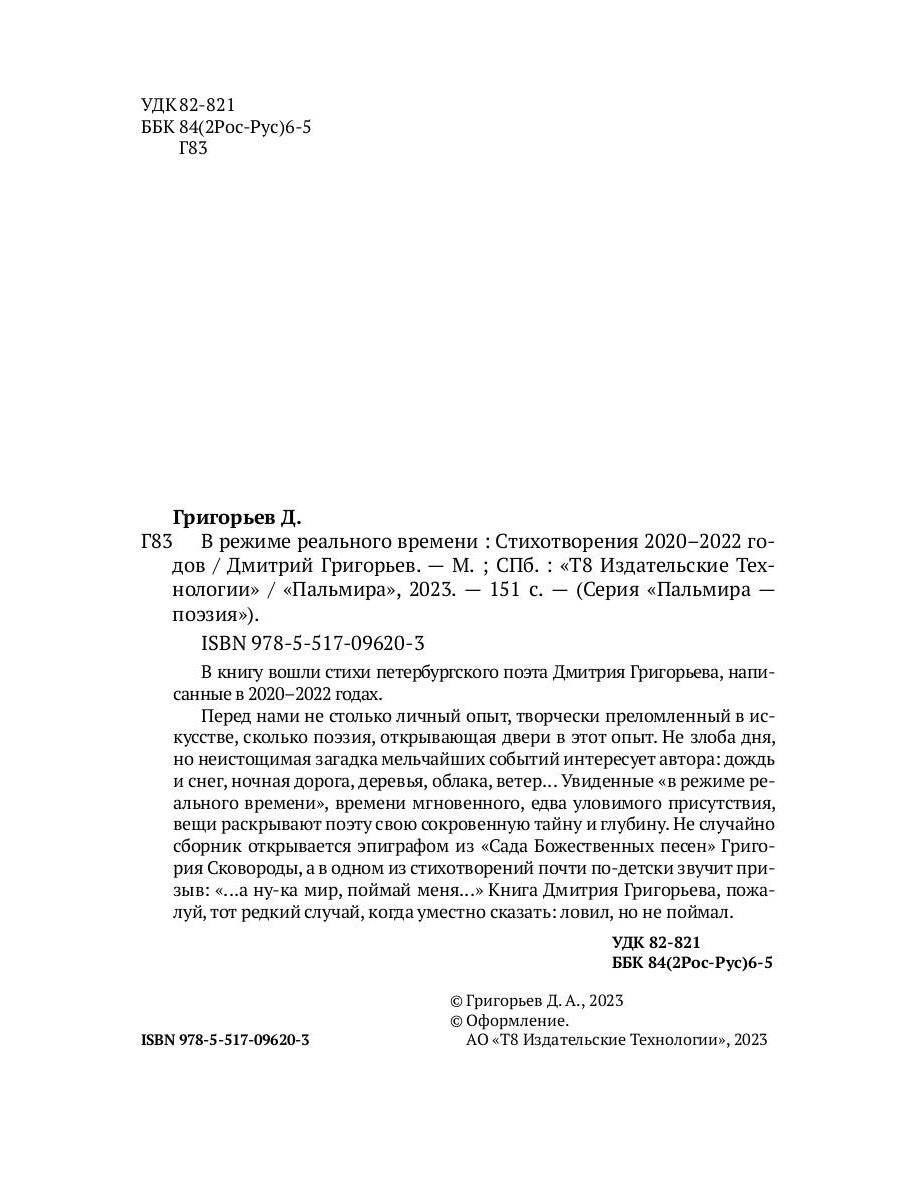 "В режиме реального времени" - книга стихов петербургского поэта и прозаика Дмитрия Григорьева, написанных в 2020–2022 годах. Книга создает ощущение продуваемости необычным ветром. Словно человек в легком пальто идет навстречу потоку бытия, которое, протекая сквозь него, обретает новые смыслы. Воздух становится прозрачнее, все видится четче и ярче. Алла Горбунова Григорьев склонен путать следы, творить реальность, вылавливать из нее мифы, благодаря чему самое обыденное и непритязательное легко преломляется в захватывающую фантасмагорию, а легкомысленная байка - в действенный манифест во имя радости и свободы. Анастасия Романова Вот о чем я хотел и, наверное, мог бы просить: "станцуй мне огонь... забинтуй эту долгую ночь", - неважно, будь это первым или (от сумы да от тюрьмы!) последним желанием. Хорошо, если друг уже нашел за тебя необходимые тебе слова. Сергей Морейно