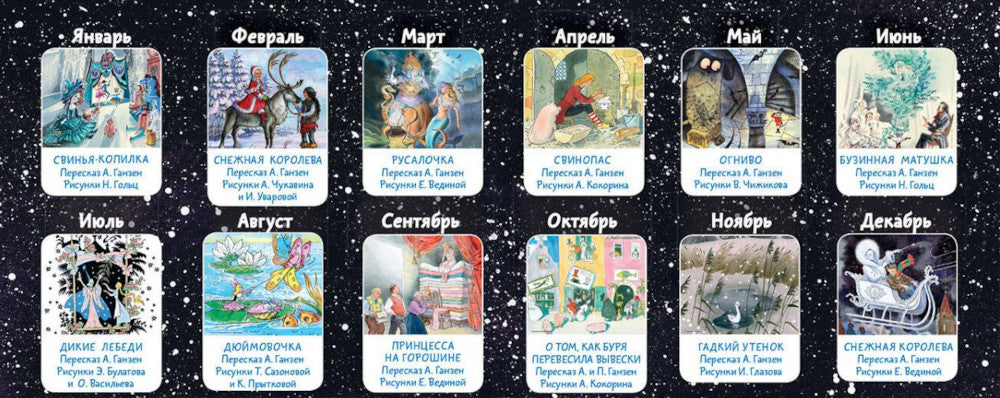 Великий сказочник Ханс Кристиан Андерсен известен во всём мире! Его волшебными, трогательными сказками зачитываются в каждом уголке земного шара! Яркие, запоминающиеся персонажи сказок будто сходят к нам со страниц его книг. Принцесса на горошине, стойкий оловянный солдатик, Снежная королева, гадкий утёнок, Русалочка — всех и не перечислишь! В нашем календаре мы собрали самые лучших героев сказок Ханса Кристиана Андерсена, которые нарисовали выдающиеся художники, — Э. Булатов и О. Васильев, В. Чижиков, Ника Гольц, А. Кокорин и другие. Пусть наступающий 2005-й год будет по-настоящему волшебным!