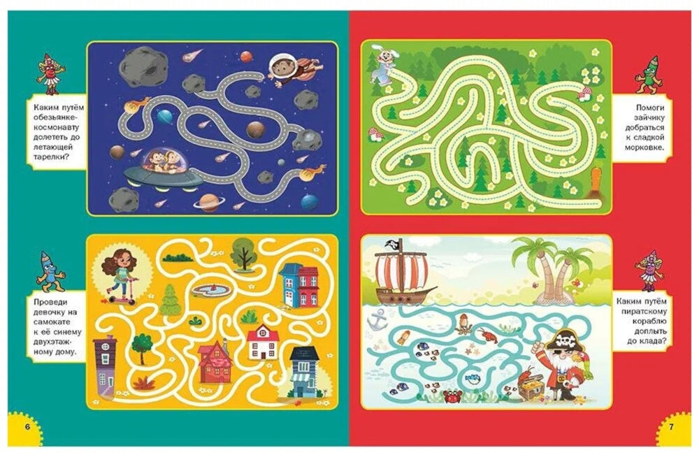 Дорогие родители! Перед вами книжка с несложными лабиринтами, которые ваш малыш будет с интересом разглядывать и, вероятно, впервые самостоятельно «попутешествует» и по заснеженным горам, и по космосу, и по морскому дну, развивая своё внимание. Это занятие-игра поможет ему в развитии мелкой моторики, расширит его кругозор. Вместе со своим ребёнком вы весело и с пользой проведёте время!