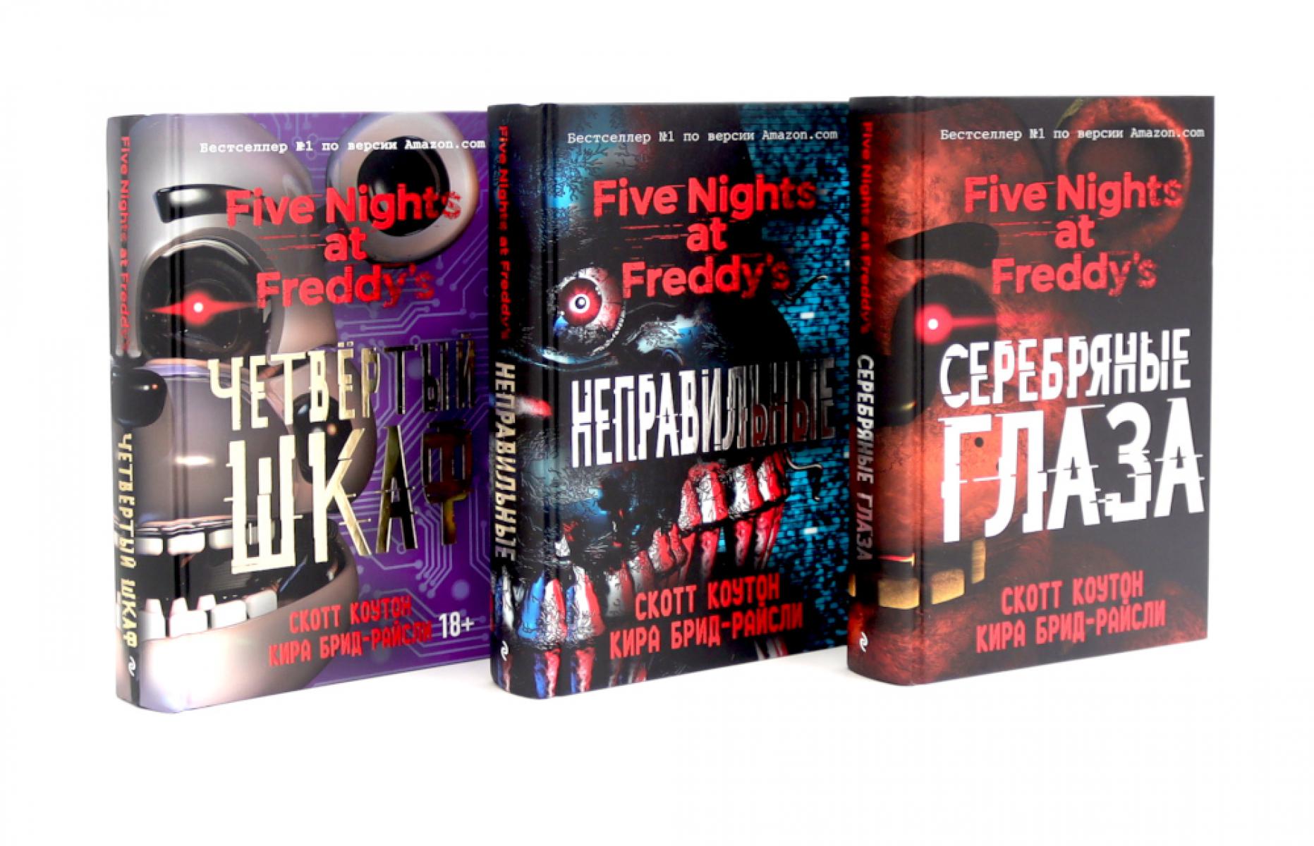 Комплект «Пять ночей у Фредди» содержит книги. «Серебряные глаза» Много лет назад аниматроники, специально сконструированные животные-талисманы, развлекали посетителей пиццерии «У Фредди Фазбера». Но затем случилась жуткая трагедия, в результате которой заведение пришлось закрыть. Чарли, дочь создателя аниматроников, возвращается в родной город и вместе с друзьями отправляется в проклятую закусочную. Подростки и не представляли, какой кровавый кошмар их ожидает внутри. «Five Nights at Freddy’s» — культовая компьютерная игра в жанре хоррор, которая стала одной из самых популярных игр в своем жанре, а также удостоилась высоких оценок критиков за уникальный подход. Роман расширяет вселенную «Five Nights at Freddy’s», позволяя читателю не только проникнуться духом игры, но и узнать предысторию событий. «Неправильные» Как бы Чарли ни хотела забыть прошлое, у нее не выходит. Воспоминания преследуют ее, а лицо маньяка, от чьей руки они едва не погибли год назад, стоит перед глазами. Но, похоже, кошмар начинается снова. Неподалеку от школы Чарли находят изуродованные тела с характерными отметинами. Неужели кто-то другой начал собирать свою кровавую жатву? Ведь Дэйв умер, разве не так? У Чарли нет времени — нужно действовать быстро, потому что на нее открыта охота и никакие друзья на этот раз не спасут девушку... «Five Nights at Freddy’s» — культовая компьютерная игра в жанре хоррор, которая стала одной из самых популярных игр в своем жанре, а также удостоилась высоких оценок критиков за уникальный подход. Роман расширяет вселенную «Five Nights at Freddy’s», позволяя читателю не только проникнуться духом игры, но и узнать предысторию событий. «Четвертый шкаф» Что случилось с Чарли? Этот вопрос продолжает мучить Джона. Его преследуют ночные кошмары, в которых его девушка умирает в костюме аниматроника. Он хочет забыть трагедию, произошедшую в пиццерии «Фредди Фазбера»... Как-то бессонной ночью, бродя по городу, он встречает старую подругу Джессику, которая приглашает его на встречу друзей и умоляет поговорить с Чарли, которая очень страдает из-за его холодности. Вот только Джон абсолютно уверен, что его Чарли умерла... «Five Nights at Freddy’s» — культовая компьютерная игра в жанре хоррор, которая стала одной из самых популярных игр в своем жанре, а также удостоилась высоких оценок критиков за уникальный подход. Роман расширяет вселенную «Five Nights at Freddy’s», позволяя читателю не только проникнуться духом игры, но и узнать предысторию.