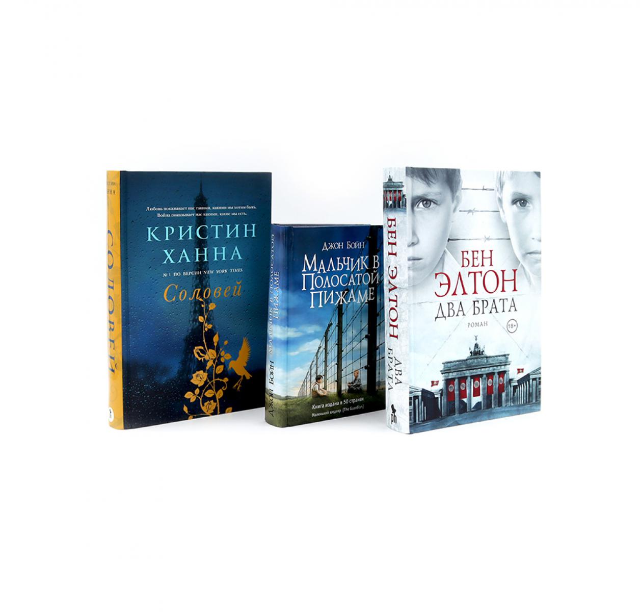 Комплект содержит книги. «Два брата» 24 февраля 1920 года в Берлине рождаются два младенца, которым суждено стать братьями. В тот же день в Мюнхене создана Национал-социалистическая партия. Пауль и Отто неразлучны и оба похожи на своих еврейских родителей, хотя совсем не похожи друг на друга. Они и не догадываются, что один из них приемыш, — более того, не еврей. Их отец играет по джазовым клубам, мать лечит больных, жизнь в Германии, еле приходящей в себя после Великой войны, потихоньку налаживается. Братья вместе растут, вместе дружат с одной девочкой, вместе влюбляются в другую. Но когда к власти приходят нацисты, жизнь меняется необратимо и страшно: в кошмарной стране внезапно важнее всего оказываются кровь и происхождение. Бен Элтон — британский писатель, режиссер, сценарист ситкома «Черная Гадюка» и создатель мюзикла «We Will Rock You» — написал пронзительный и честный роман по мотивам истории своей семьи. Как и в жизни, здесь есть смех и слезы, нежность и злость, верность и предательства. Это история о том, чем готовы пожертвовать люди ради выживания — своего и тех, кого они любят. Что им делать с каждодневной ненавистью, с неотступной памятью, с неутихающей болью — и как из этого всего порой прорастают одиночество, страх и жестокость, а порой — доброта, мудрость и счастье. «Мальчик в полосатой пижаме» Не так-то просто рассказать в двух словах об этой удивительной книге. Обычно аннотация дает читателю понять, о чем пойдет речь, но в данном случае мы опасаемся, что любые предварительные выводы или подсказки только помешают ему. Нам представляется очень важным, чтобы вы начали читать, не ведая, что вас ждет. Скажем лишь, что вас ждет необычное и завораживающее путешествие вместе с девятилетним мальчиком по имени Бруно. Вот только сразу предупреждаем, что книга эта никак не предназначена для детей девятилетнего возраста, напротив, это очень взрослая книга, обращенная к людям, которые знают, что такое колючая проволока. Именно колючая проволока вырастет на вашем с Бруно пути. Такого рода ограждения достаточно распространены в нашем мире. И нам остается только надеяться, что вы лично в реальной жизни не столкнетесь ни с чем подобным. Книга же наверняка захватит вас и вряд ли скоро отпустит. «Соловей» Франция, 1939-й. В уютной деревушке Карриво Вианна Мориак прощается с мужем, который уходит воевать с немцами. Она не верит, что нацисты вторгнутся во Францию... Но уже вскоре мимо ее дома грохочут вереницы танков, небо едва видать от самолетов, сбрасывающих бомбы. Война пришла в тихую французскую глушь. Перед Вианной стоит выбор: либо пустить на постой немецкого офицера, либо лишиться всего — возможно, и жизни. Изабель Россиньоль, мятежная и своенравная восемнадцатилетняя девчонка, полна решимости бороться с захватчиками. Безрассудная и рисковая, она готова на все, но отец вынуждает ее отправиться в деревню к старшей сестре. Так начинается ее путь в Сопротивление. Изабель не оглядывается назад и не жалеет о своих поступках. Снова и снова рискуя жизнью, она спасает людей. «Соловей» — эпическая история о войне, жертвах, страданиях и великой любви. Душераздирающе красивый роман, ставший настоящим гимном женской храбрости и силе духа. Роман для всех, роман на всю жизнь. Книга Кристин Ханны стала гл