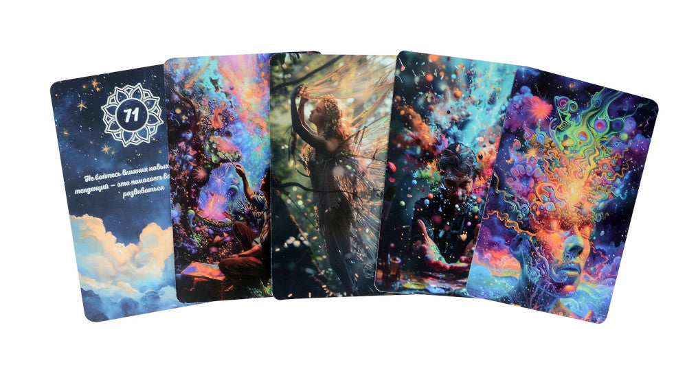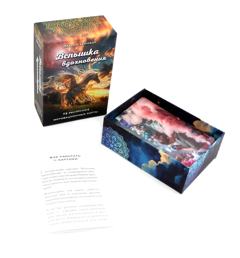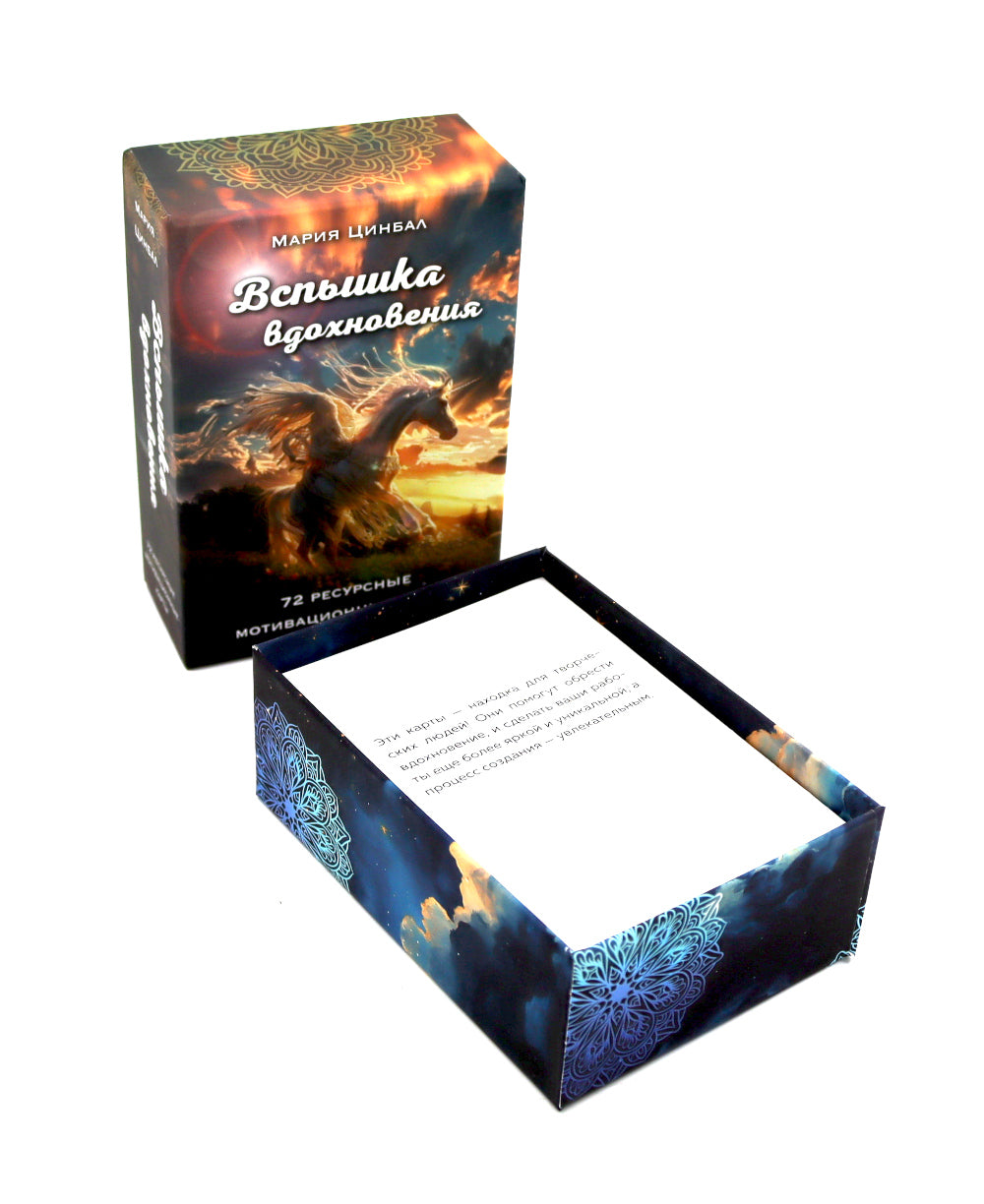 Достаньте карту из колоды и поймайте поток вдохновения! «Вспышка вдохновения» — это 72 уникальные карты, созданные специально для тех, кто ищет новые идеи, мечтает раскрыть свой творческий потенциал и освободиться от всех барьеров, мешающих творить. Эти карты от Марии Цинбал помогут победить творческий застой или страх «белого листа». Каждая карта — это больше, чем просто совет. Это поддержка, уверенность, смелость и мотивация в одном послании. Оно поможет вам преодолеть преграды и настроиться на волну созидания. Каждое изображение и каждое слово на карте призваны пробудить ваш внутренний голос, вернуть веру в себя и свои способности. Эти карты — как личный талисман, который всегда под рукой.