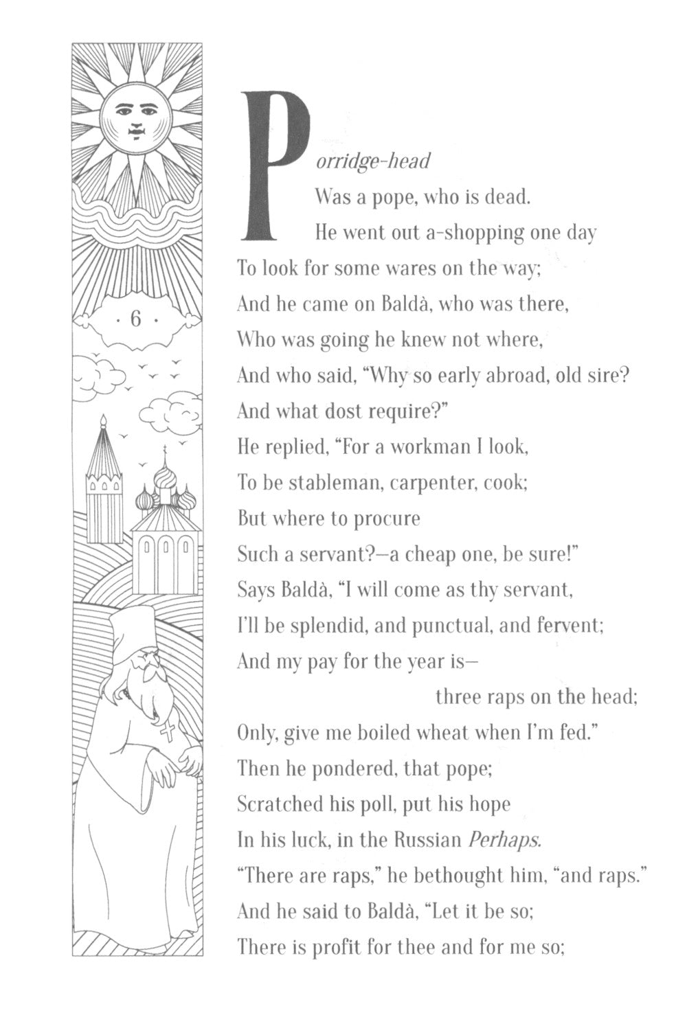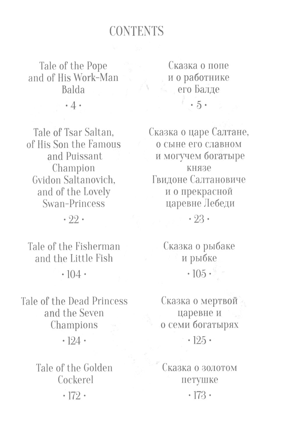 Сборник сказок А. С. Пушкина представляет собой билингву: оригинальный текст на русском языке дополнен параллельным переводом на английский. В книгу вошли пять произведений: «Сказка о попе и о работнике его Балде», «Сказка о царе Салтане», «Сказка о рыбаке и рыбке», «Сказка о мертвой царевне и о семи богатырях» и «Сказка о золотом петушке». Стихотворный перевод выполнен Оливером Элтоном, британским литературоведом, критиком и переводчиком с русского и исландского языков. Книга адресована школьникам, но будет интересна всем, кто изучает английский язык, хочет улучшить навыки чтения и расширить свой словарный запас, а также тем, кому чтение произведений А. С. Пушкина доставляет удовольствие и радость.