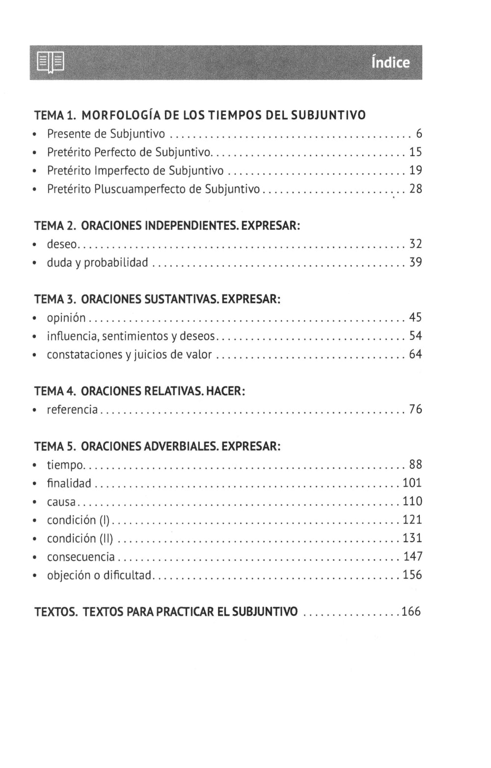 Учебник предназначен для студентов, совершенствующихся во владении испанским языком на уровне В1-В2. Состоит из пяти тем и подборки текстов для их закрепления. Первая тема представлена морфологией четырех времен (presente, preterito perfecto, imperfecto, pluscuamperfecto de subjuntivo) и упражнениями на образование форм. Остальные темы посвящены изучению различных значений в oraciones independientes (deseo, duda y probabilidad), oraciones sustantivas (opinion, influencia, sentimientos y deseos, constataciones y juicios de valor), oraciones relativas (referencia), oraciones adverbiales (tiempo, finalidad, causa, condicion I, condicion II, consecuencia, objecion o dificultad). Данное издание выгодно отличается акцентом на изучении выражаемого значения в конкретных ситуациях вербального общения в разговорной речи, а не на механическом воспроизведении глагольных форм в зависимости от наличия маркеров modo subjuntivo.