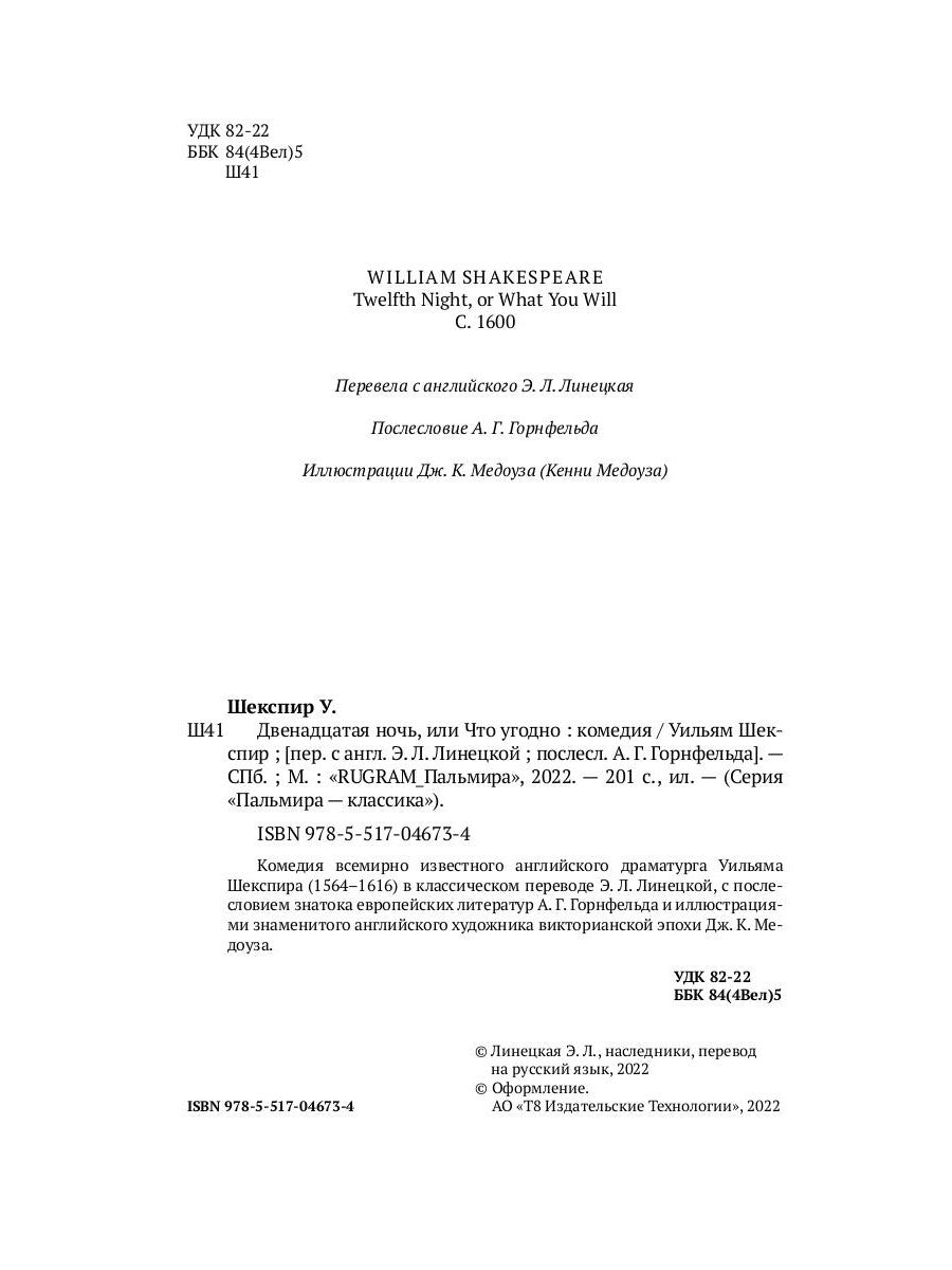 Комедия всемирно известного английского драматурга Уильяма Шекспира (1564-1616) в классическом переводе Э. Л. Линецкой, с послесловием знатока европейских литератур А. Г. Горнфельда и иллюстрациями знаменитого английского художника викторианской эпохи Дж. К. Медоуза.