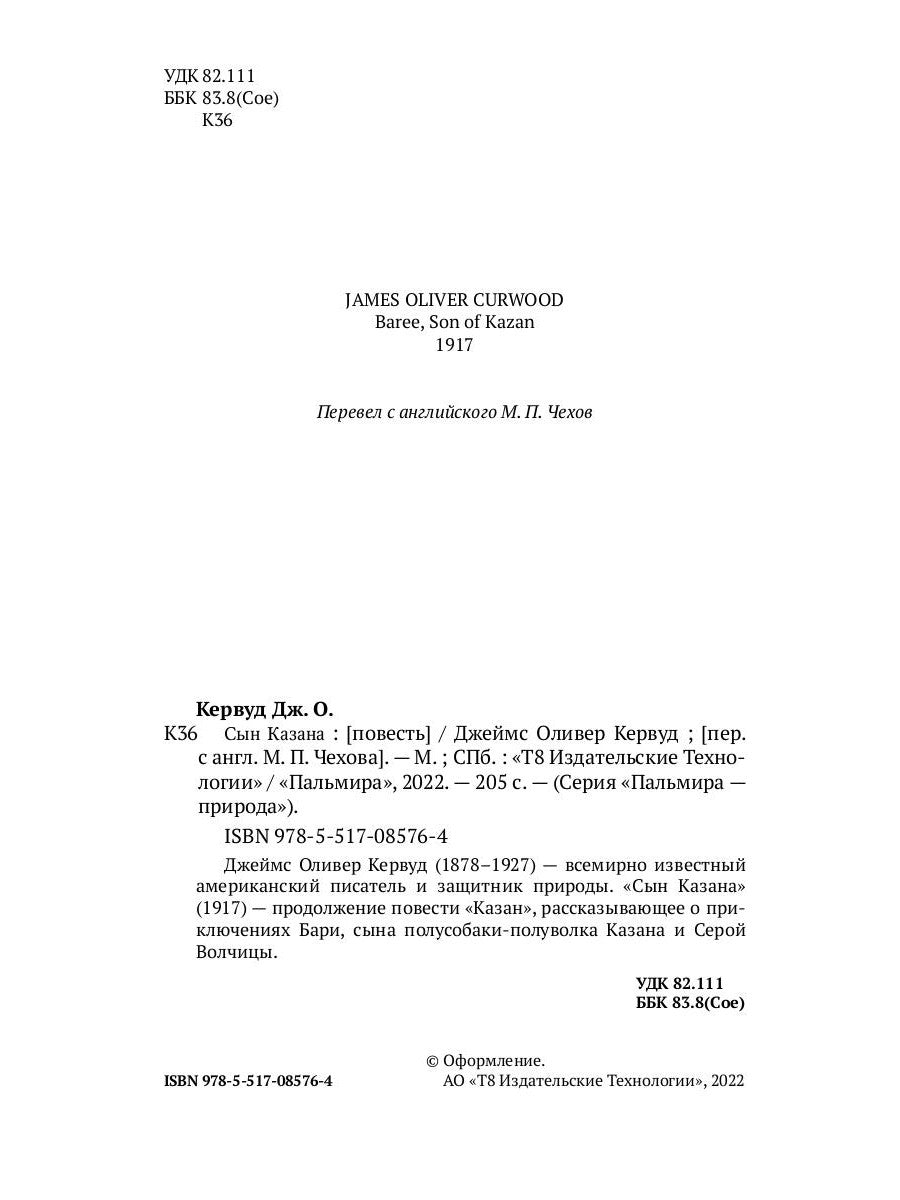 Джеймс Оливер Кервуд (1878–1927) — всемирно известный американский писатель и защитник природы. «Сын Казана» (1917) — продолжение повести «Казан», рассказывающее о приключениях Бари, сына полусобаки-полуволка Казана и Серой Волчицы.