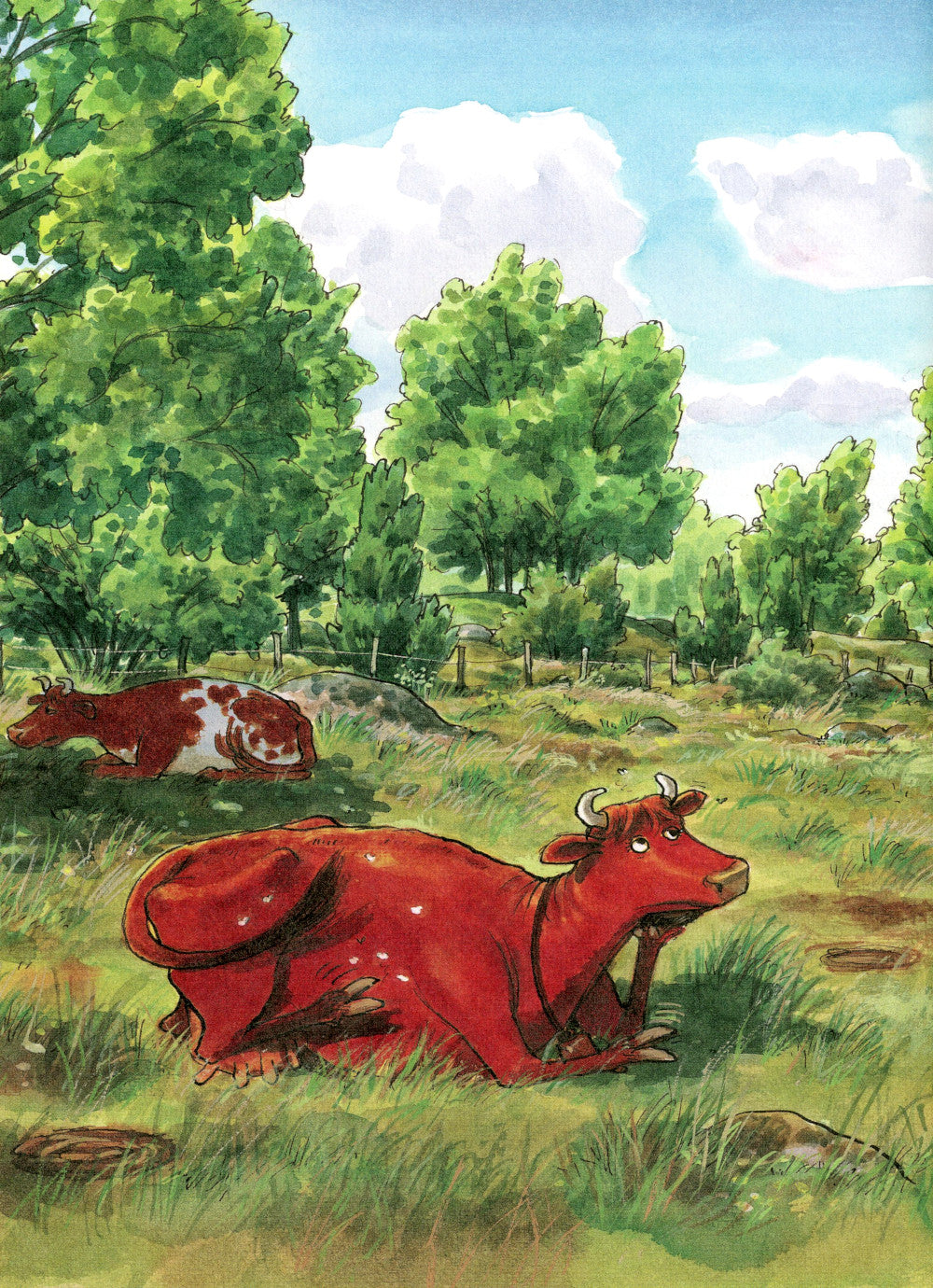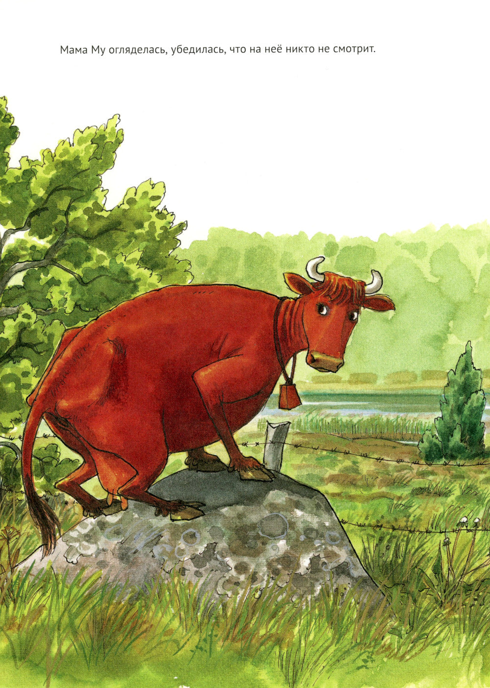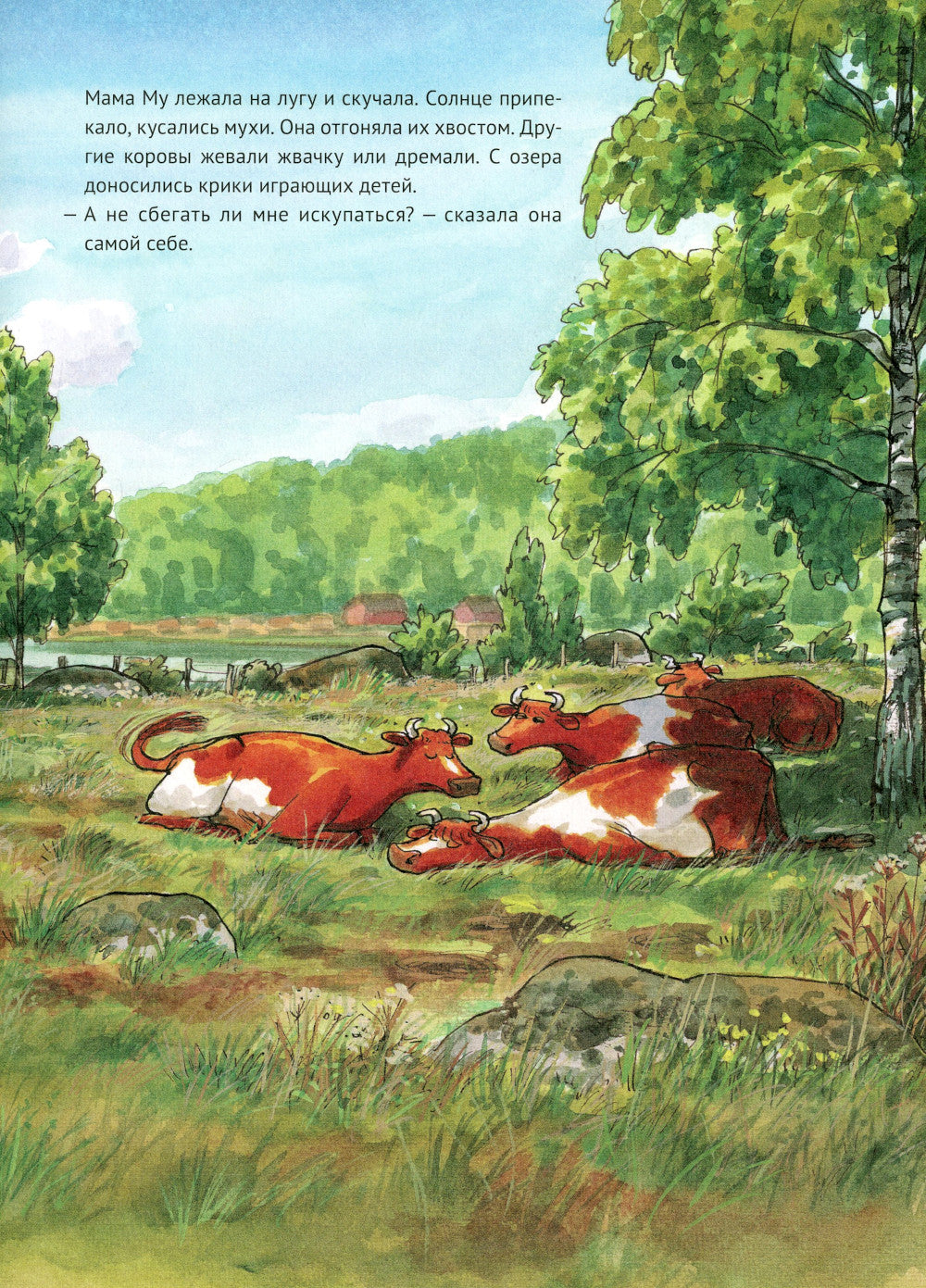 Самая непоседливая на свете корова Мама Му не может спокойно пастись на лугу, когда на дворе стоит погожий денёк. Она украдкой сбегает на озеро. Но по дороге Мама Му падает! На голове шишка, на животе рана. На помощь приходит верный друг Кракс. Уж он-то знает, как вылечить корову, которая любит приключения. Книги о Маме Му и Краксе переведены на 30 языков и известны во всём мире. Их авторы - Юя Висландер, почётный член шведской Академии детской книги, и Свен Нурдквист, получивший мировую известность благодаря книгам о Петсоне и Финдусе.