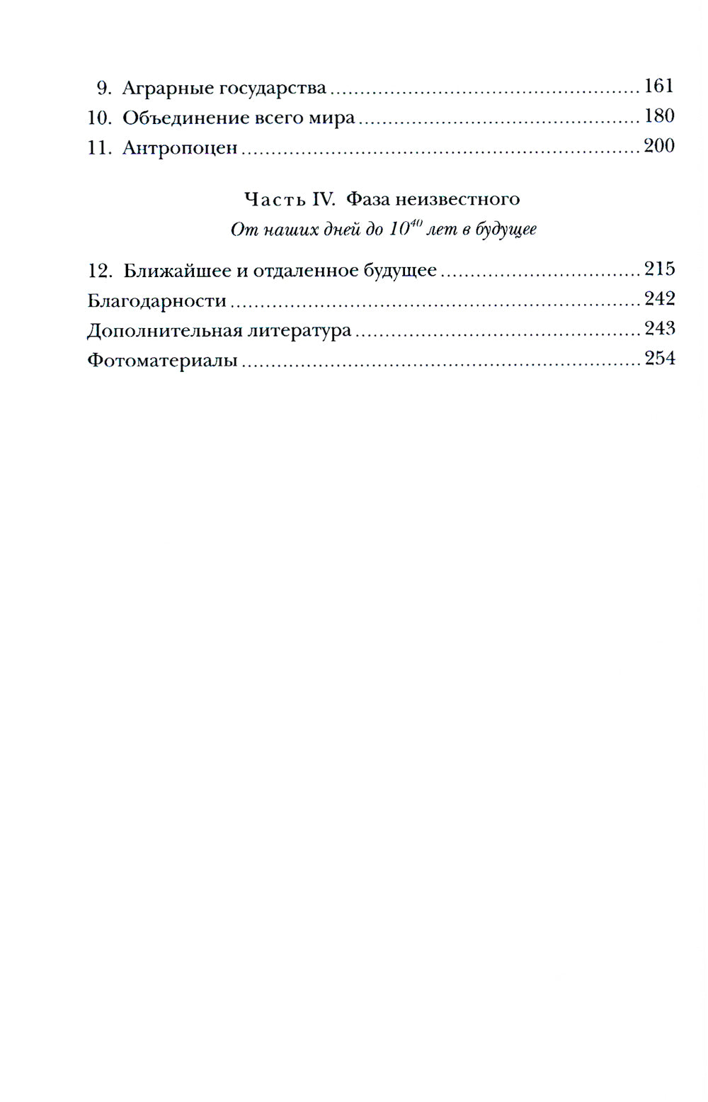 «В этой книге рассказывается о процессе исторических изменений всех элементов в космосе от Большого взрыва к эволюции жизни и истории человечества — как простые скопления водорода превращаются в сложные человеческие сообщества. Обычно история позволяет нам прожить много жизней вместо одной, а эта конкретная история предлагает опыт миллиардов лет… Что касается будущего, то я говорю о следующем столетии, следующей тысяче лет, следующем миллионе, миллиарде и даже триллионе и квадриллионе лет, до потенциального конца нашей Вселенной». (Дэвид Бейкер)