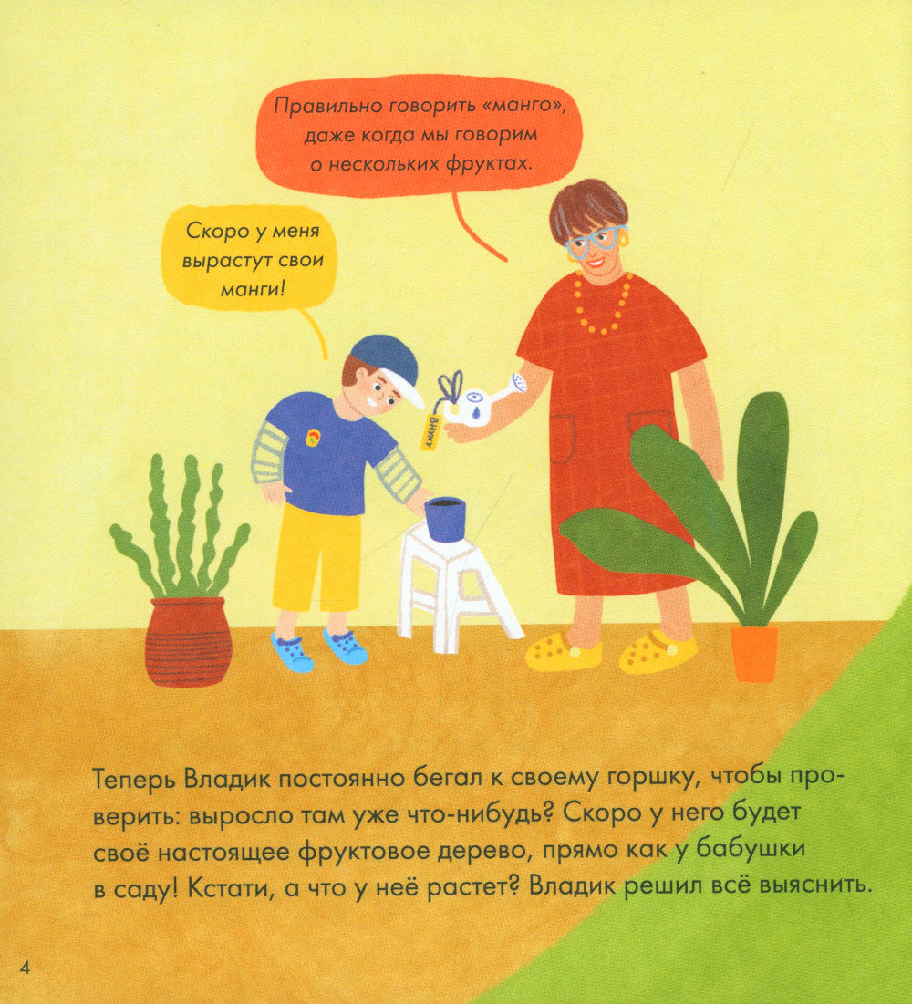 Владик проводит каникулы на даче у бабушки, и однажды она угощает его необычным фруктом — вкуснейшим манго. Внутри обнаруживается косточка, и Владик решает её посадить. Ему так хочется вырастить своё собственное манговое деревце, что он решает узнать о фруктах всё. Почему у бабушки растут яблоки и смородина, а бананы и ананасы нет? Отчего раньше экзотические фрукты были редкостью, а сейчас они доступны круглый год? Какие животные питаются почти одними только фруктами и может ли так человек? И, наконец, почему фрукты должны быть в рационе каждого человека? Для детей от 3 лет.