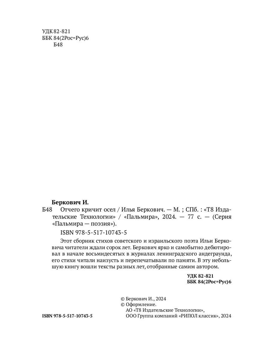 Этот сборник стихов советского и израильского поэта Ильи Берковича читатели ждали сорок лет. Беркович ярко и самобытно дебютировал в начале восьмидесятых в журналах ленинградского андеграунда, его стихи читали наизусть и перепечатывали по памяти. В эту небольшую книгу вошли тексты разных лет, отобранные самим автором.