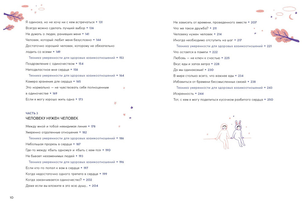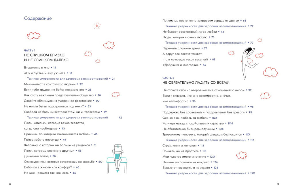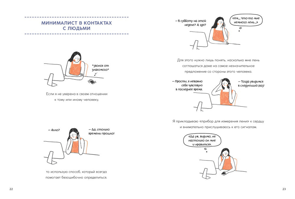 Минимализм — это не просто мода, это стиль жизни, и речь не только о дизайне, но и об отношениях. Прекратить общаться с токсичным партнером или скучным приятелем — не значит быть эгоцентричным человеком. «Хочу быть откровенной с собой. Пришла пора честно проанализировать свои отношения с окружающими и понять, что я действительно испытываю…» — так решила популярная корейская художница Танцующая Улиточка и стала создавать иллюстрированные эссе в виде советов и историй из личной жизни. Художница дала ответы на такие волнующие каждого вопросы: как не уставать от людей, как выстроить здоровую дистанцию в отношениях, как не растерять настоящих друзей, как сохранить баланс в личной жизни, как не общаться с неприятными людьми из чувства долга. Остроумные, образные зарисовки позволяют сопереживать героям и понять, как помочь себе держаться на адекватной дистанции с окружающими.