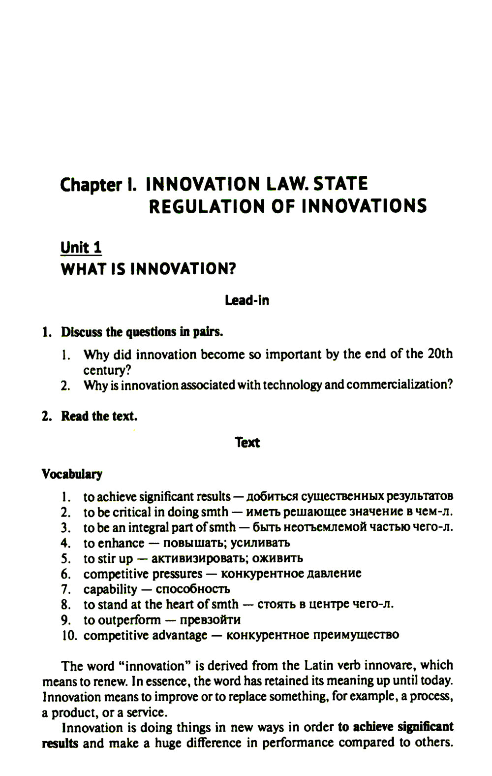 Учебное пособие знакомит студентов с основными понятиями в области инновационного права, в том числе в таких актуальных и динамично развивающихся направлениях, как биоправо, цифровое право и LegalTech. Цель данного пособия — развитие компетенций, достаточных для дальнейшего совершенствования в профессионально ориентированной сфере, а также расширение и активизация словарного запаса, развитие основных видов речевой деятельности в области профессиональной иноязычной коммуникации и формирование навыков самостоятельной работы над языком. Издание адресовано студентам и слушателям юридических вузов, обучающимся по профилю подготовки «Инновационная юриспруденция». Пособие может быть использовано при обучении широкого круга лиц, изучающих юридический английский язык.