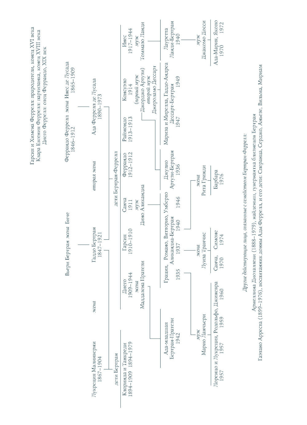 37-летняя Ада Бертран, преподавательница древнегреческой литературы в Болонском университете, а в прошлом — бунтарка и хиппи, пережив яркое эротическое приключение с незнакомцем на научной конференции в Кембридже, забывает о присущей ей рациональности и заново открывает запутанную историю своей семьи. Она начинает видеть во сне своих далеких предков, мелких дворян, живших на Сардинии, а наяву общаться со старшими членами семьи. Аде открывается множество семейных секретов: любовные интриги, трагедии и предательство, тайные роды и появление бастардов — всё, о чем в приличных семьях не принято говорить. Это навсегда меняет ее взгляды на жизнь и отношения с окружающими. В это же время в ее собственной жизни происходят драматические перемены, и Ада все лучше и лучше понимает себя. Бьянка Питцорно мастерски сплетает времена и жанры: семейная сага и психологическая проза, магический реализм и сентиментальная повесть, колорит Италии XVI и XIX веков и современность.