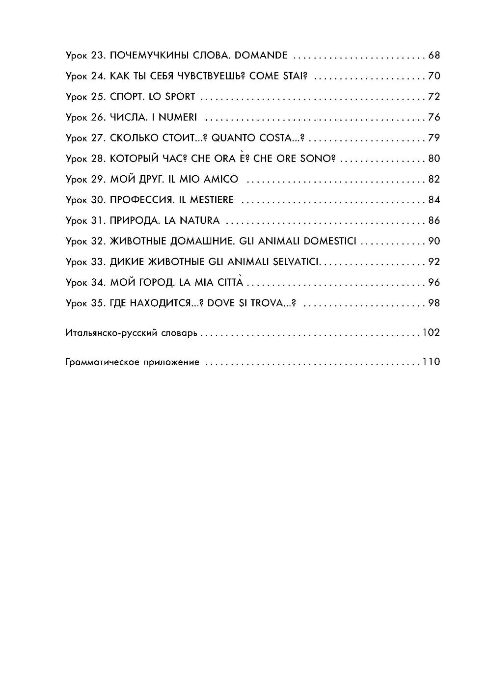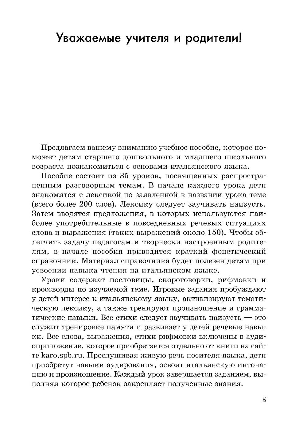 Предлагаем вашему вниманию учебное пособие, которое поможет детям старшего дошкольного и младшего школьного возраста познакомиться с основами итальянского языка. 35 уроков содержат пословицы, скороговорки, рифмовки и кроссворды по изучаемой теме. Игровые задания пробуждают у детей интерес к итальянскому языку, активизируют тематическую лексику, а также тренируют произношение и грамматические навыки. Все слова, выражения, стихи, рифмовки включены в аудиозапись, которую можно приобрести на сайте karo. spb. ru. Прослушивая живую речь носителя языка, дети приобретут навыки аудирования, усвоят итальянскую интонацию и произношение. В конце пособия приведены краткие сведения по грамматике итальянского языка и итальянско-русский словарик.