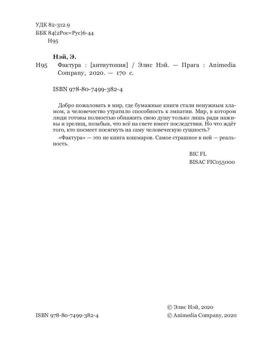 Добро пожаловать в мир, где бумажные книги стали ненужным хламом, а человечество утратило способность к эмпатии. Мир, в котором люди готовы полностью обнажить свою душу только лишь ради наживы и зрелищ, позабыв, что всё на свете имеет последствия. Но что ждёт того, кто посмеет посягнуть на саму человеческую сущность? «Фактура» — это не книга кошмаров. Самое страшное в ней — реальность.