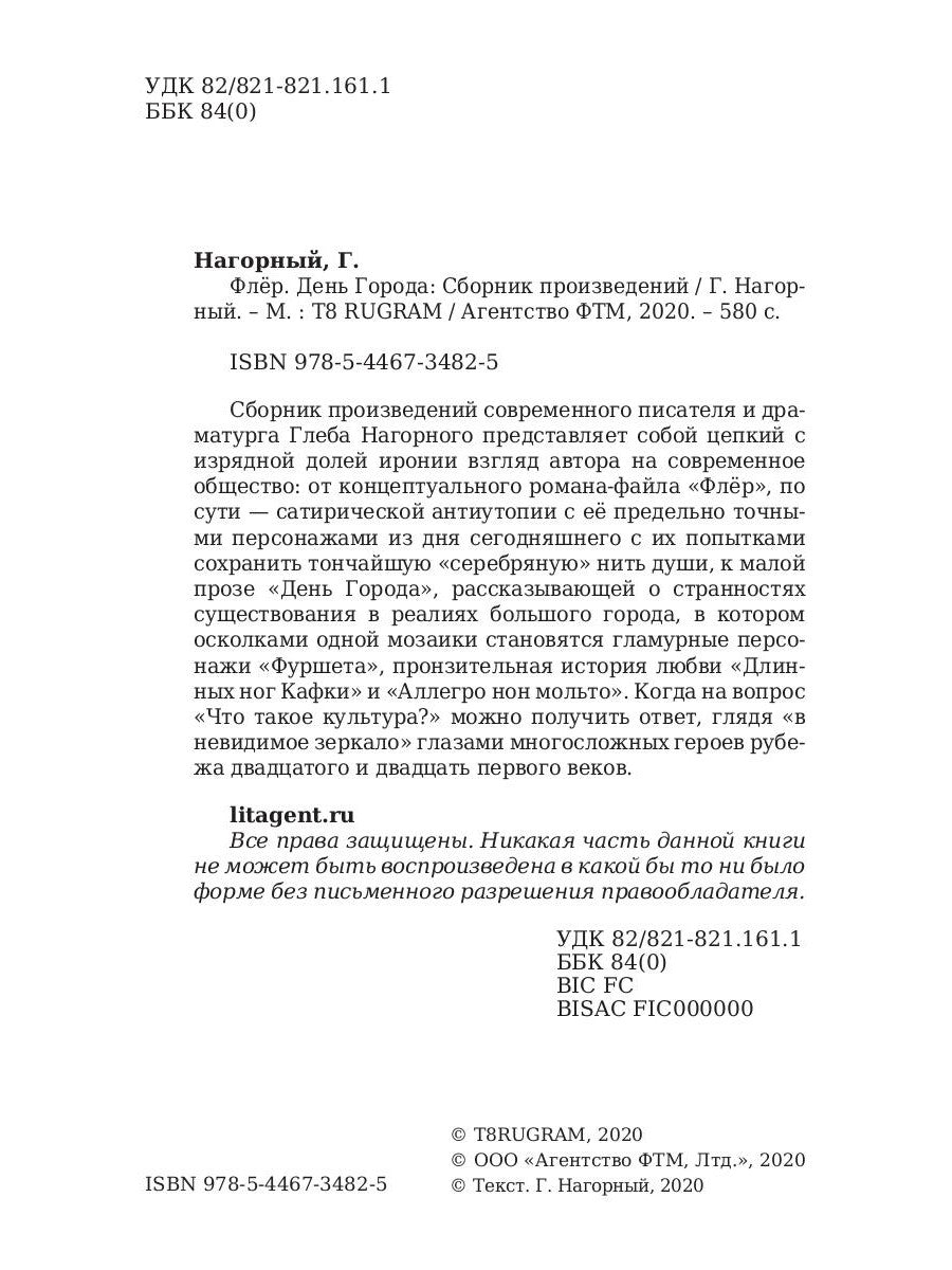 Сборник произведений современного писателя и драматурга Глеба Нагорного представляет собой цепкий с изрядной долей иронии взгляд автора на современное общество: от концептуального романа-файла «Флёр», по сути — сатирической антиутопии с её предельно точными персонажами из дня сегодняшнего с их попытками сохранить тончайшую «серебряную» нить души, к малой прозе «День Города», рассказывающей о странностях существования в реалиях большого города, в котором осколками одной мозаики становятся гламурные персонажи «Фуршета», пронзительная история любви «Длинных ног Кафки» и «Аллегро нон мольто». Когда на вопрос «Что такое культура?» можно получить ответ, глядя «в невидимое зеркало» глазами многосложных героев рубежа двадцатого и двадцать первого веков.