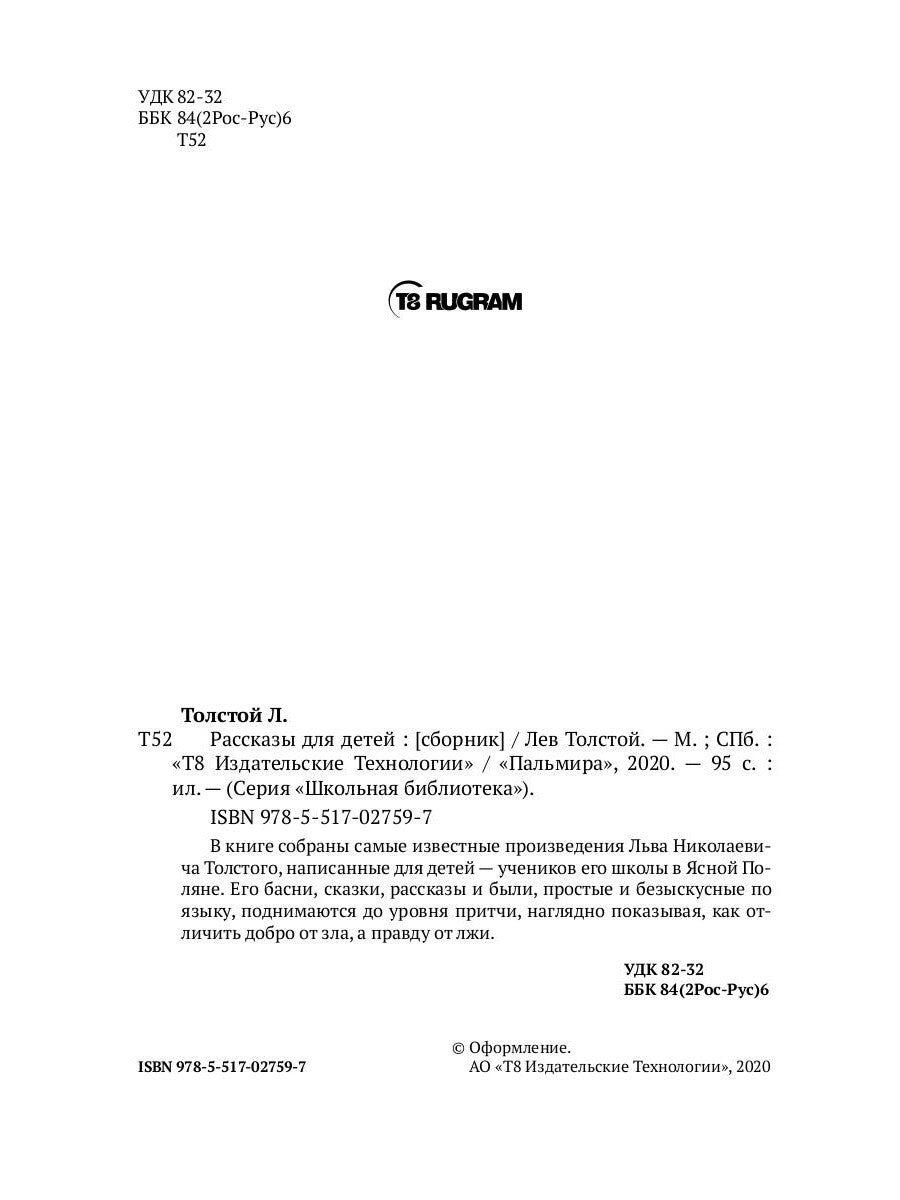 В книге собраны самые известные произведения Льва Николаевича Толстого, написанные для детей — учеников его школы в Ясной Поляне. Его басни, сказки, рассказы и были, простые и безыскусные по языку, поднимаются до уровня притчи, наглядно показывая, как отличить добро от зла, а правду от лжи.
