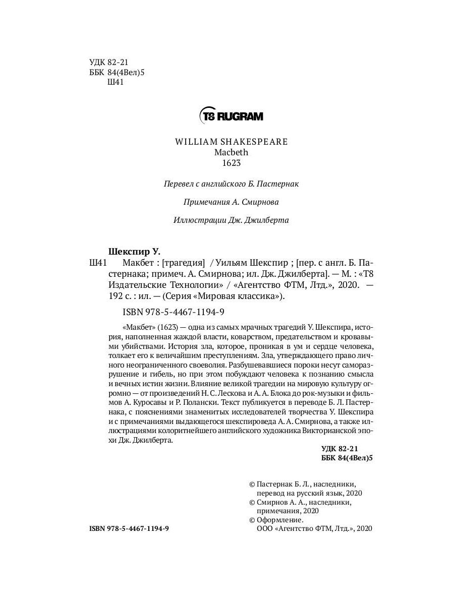 «Макбет» (1623) — одна из самых мрачных трагедий У. Шекспира, история, наполненная жаждой власти, коварством, предательством и кровавыми убийствами. История зла, которое, проникая в ум и сердце человека, толкает его к величайшим преступлениям. Зла, утверждающего право личного неограниченного своеволия. Разбушевавшиеся пороки несут саморазрушение и гибель, но при этом побуждают человека к познанию смысла и вечных истин жизни. Влияние великой трагедии на мировую культуру огромно — от произведений Н. С. Лескова и А. А. Блока до рок-музыки и фильмов А. Куросавы и Р. Полански. Текст публикуется в переводе Б. Л. Пастернака, с пояснениями знаменитых исследователей творчества У. Шекспира и с примечаниями выдающегося шекспироведа А. А. Смирнова, а также иллюстрациями колоритнейшего английского художника Викторианской эпохи Дж. Джилберта.