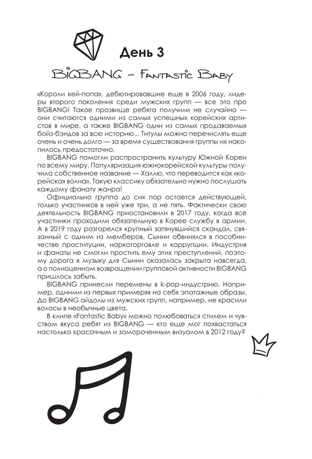 Окунитесь в удивительный и самобытный мир K-pop группы! BTS, Stray Kids, BLACKPINK — эти и многие другие коллективы подарили своим фанатам не одну классическую композицию. В книге рассказывается о 100 песнях в жанре K-pop, у каждой из которых своя история. Некоторые композиции становились хитами, другие оказались незаслуженно забыты, а некоторые прочно ассоциируются с драматическими событиями в жизни K-pop айдолов. Вы узнаете историю хитов группы BTS, с чего началось восхождение Stray Kids на вершину поддерживаемых чартов, стиль какой музыкальной группы переняла для одной из своих песен группа ATEEZ, какие смыслы в записана в своих песнях (G)I-DLE — и многое другое!