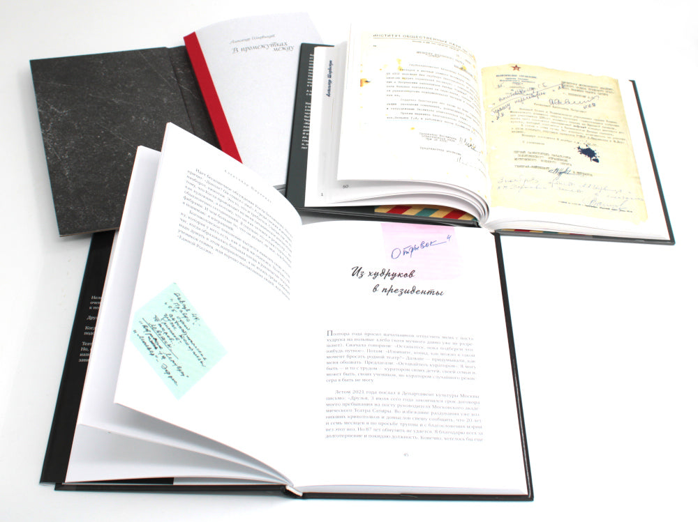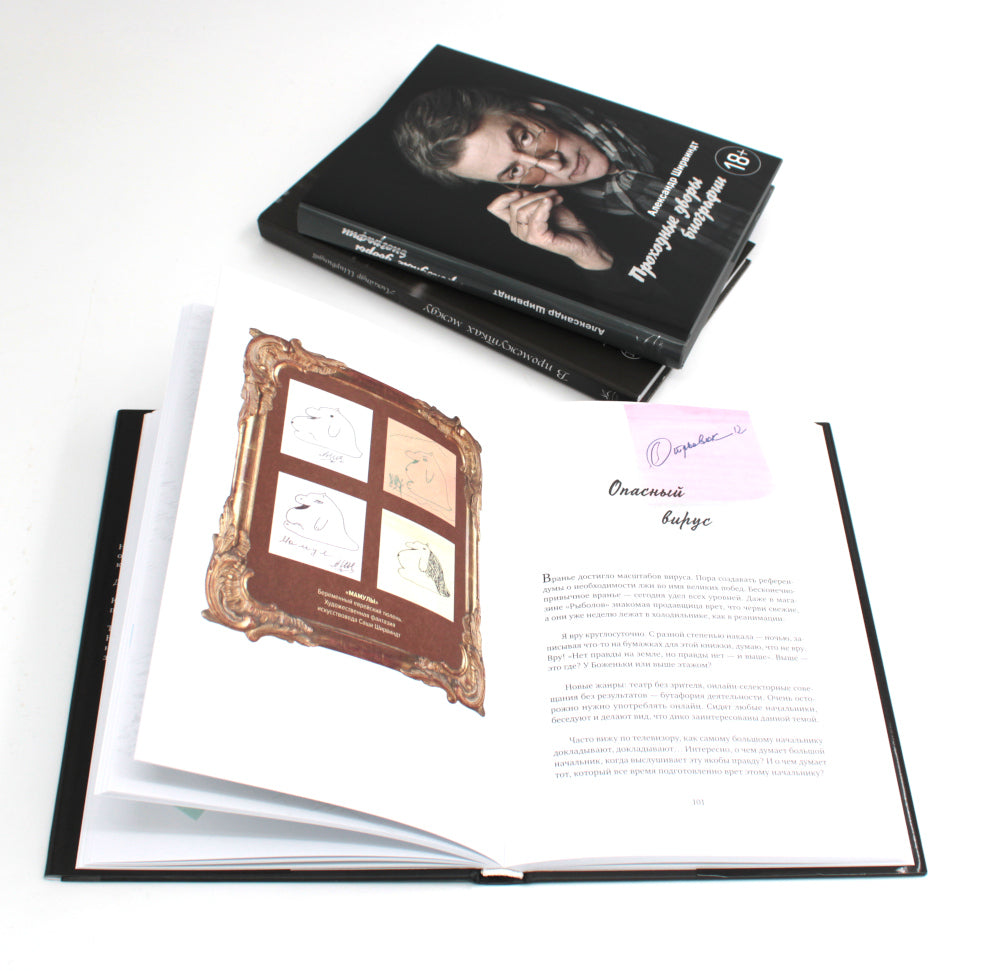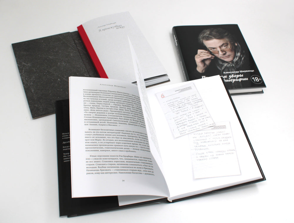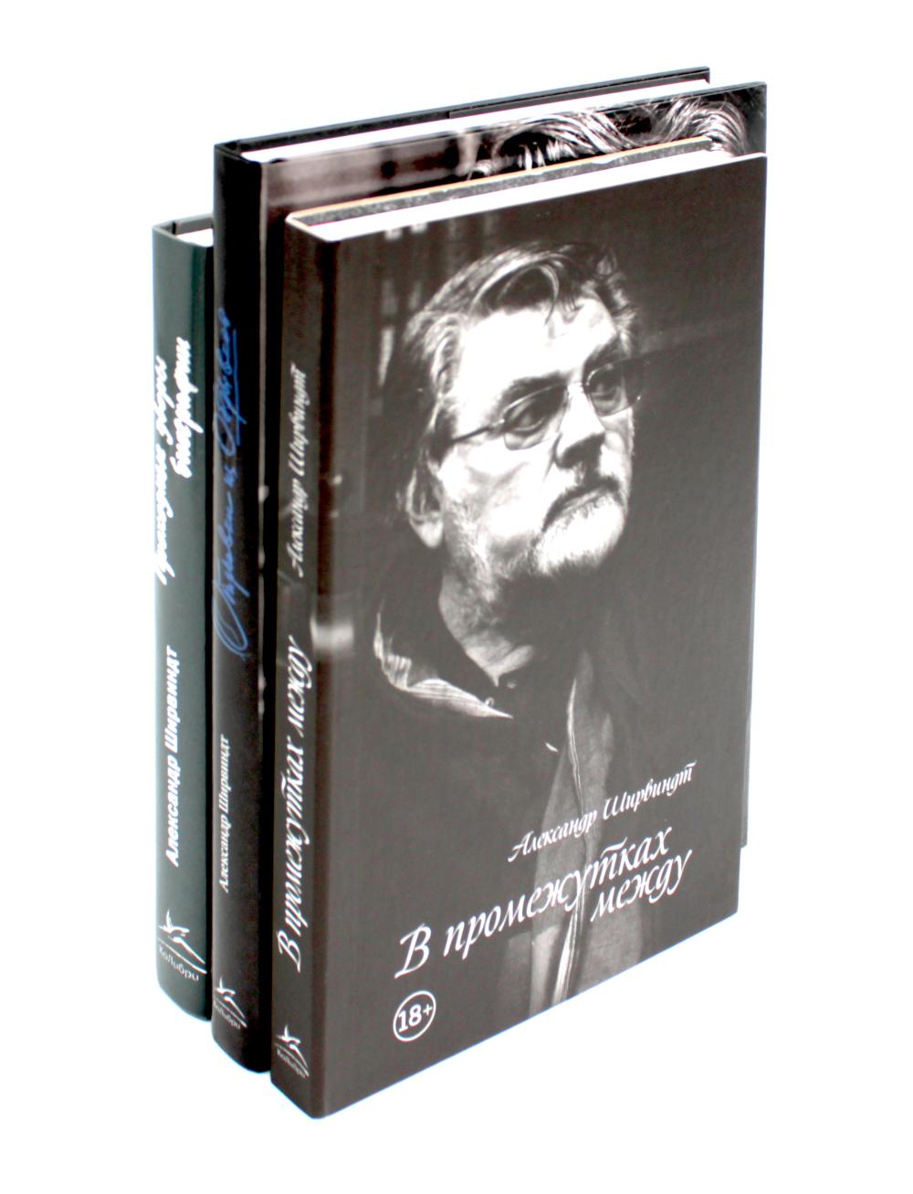 Комплект из 3 книг: «В промежутках между», «Отрывки из обрывков», «Проходные дворы биографии». «В промежутках между» Вся наша жизнь — это существование в промежутках между ними. Между юбилеями и панихидами, между удачами и неудачами, между болезнями и кризисами, между днем ​​и ночью, вообще, между рождением и смертью возникает пространство, когда человек вынужден думать. А когда начинаешь думать, то рефлекторно хочется поделиться чем-нибудь с кем-нибудь, кроме самого себя... «Отрывки из обрывков» В новой книге «Отрывки из обрывков», написанной в разгар пандемии, актер и режиссер Александр Ширвиндт рассуждает о актуальных для всех нас событиях — коронавирусе и самоизоляции, семье и друзьях, футболе и успехах российской сборной на Олимпиаде. Обращается Ширвиндт и к своим воспоминаниям: учеба в школе и преподавание в Театральном институте имени Щукина; работа над спектаклями и съемками в любимых фильмах. Непревзойденный рассказчик, автор рассказов удивительных историй своих коллег и друзей, вспоминающий Олега Табакова и Марку Захарову, Андрею Миронову и Людмилу Гурченко, Михаила Жванецкого и Булату Окуджаву, Владимиру Меньшову и Валентину Гафту, Михаилу Державину и Зиновию Гердту. «Проходные дворы биографии» Новая книга Александра Ширвиндта — неразмерное и скучное повествование. По словам самого автора: «Это не литература и не скрупулезная биографическая справка. Это — чехарда воспоминаний». О самых непростых моментах жизни Ширвиндт рассказывает в знаменитой ироничной манере, безошибочно снисходя к себе и другим. Итак, «Проходные дворы биографии». Маршрут простой: от самого начала, от родильного дома, до, слава богу, пока не самого конца».