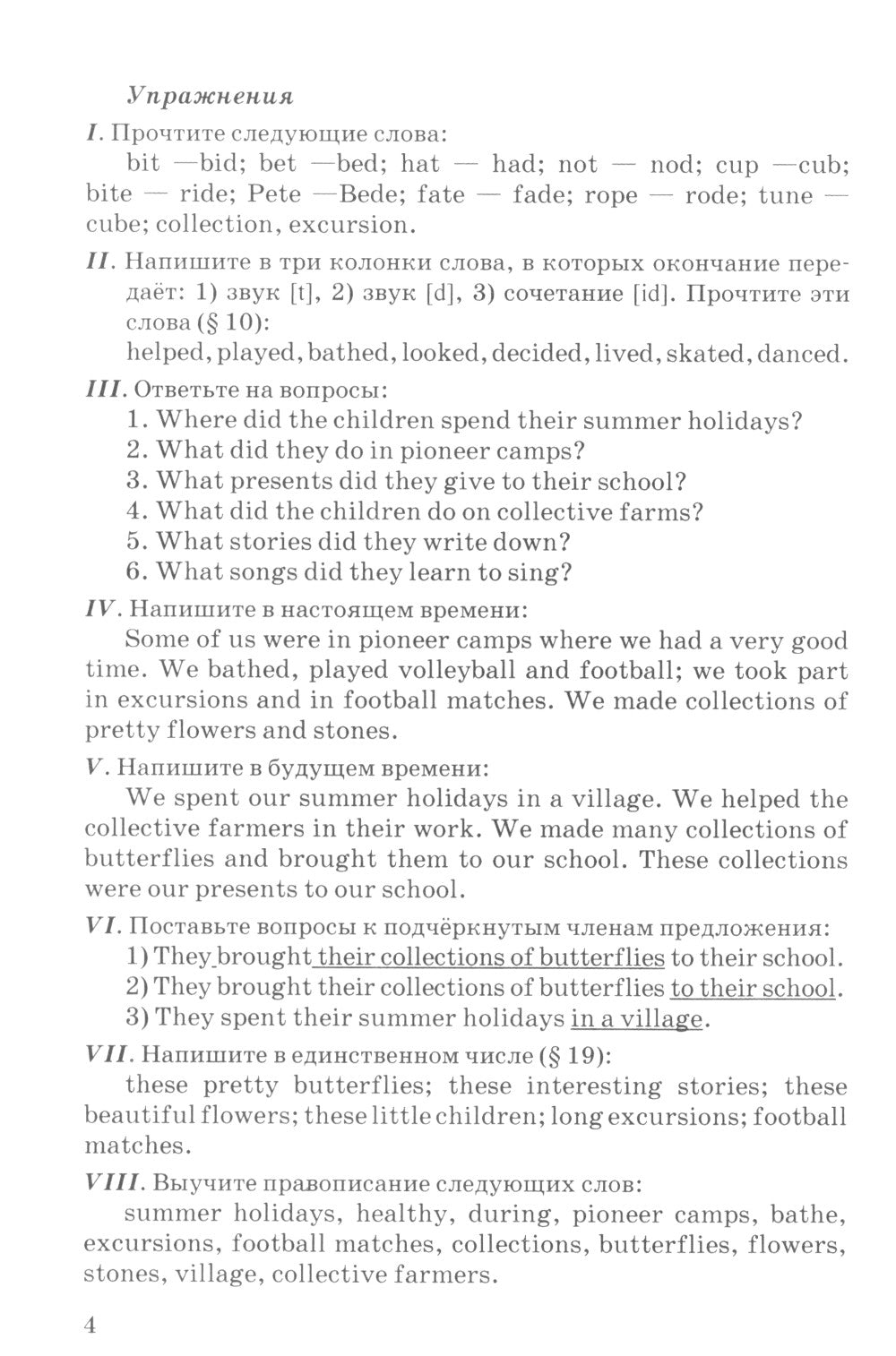 Настоящий учебник по английскому языку для обучения 6 класса, предназначенный для четвёртого года обучения иностранному языку. Для удобства восприятия новой информации программа разделена на 20 часов, каждый из которых снабжен упражнениями на чтение, письмо и закрепление грамматических и синтаксических правил. Школьники познакомятся с прошедшими длительными и настоящими совершёнными временами, сравнительной и превосходной степями многосложных включений, притяжательными местаимениями и суффиксальным способом словообразования. Алфавитный словарь облегчит ознакомление учащихся с новой лексикой, а справочные правила помогут закрепить изученный материал. Приложение к изданию содержит подробный план-оглавление по учебным четвертям с указанием тем для повторения, а также перечнем новых слов и высказываний.