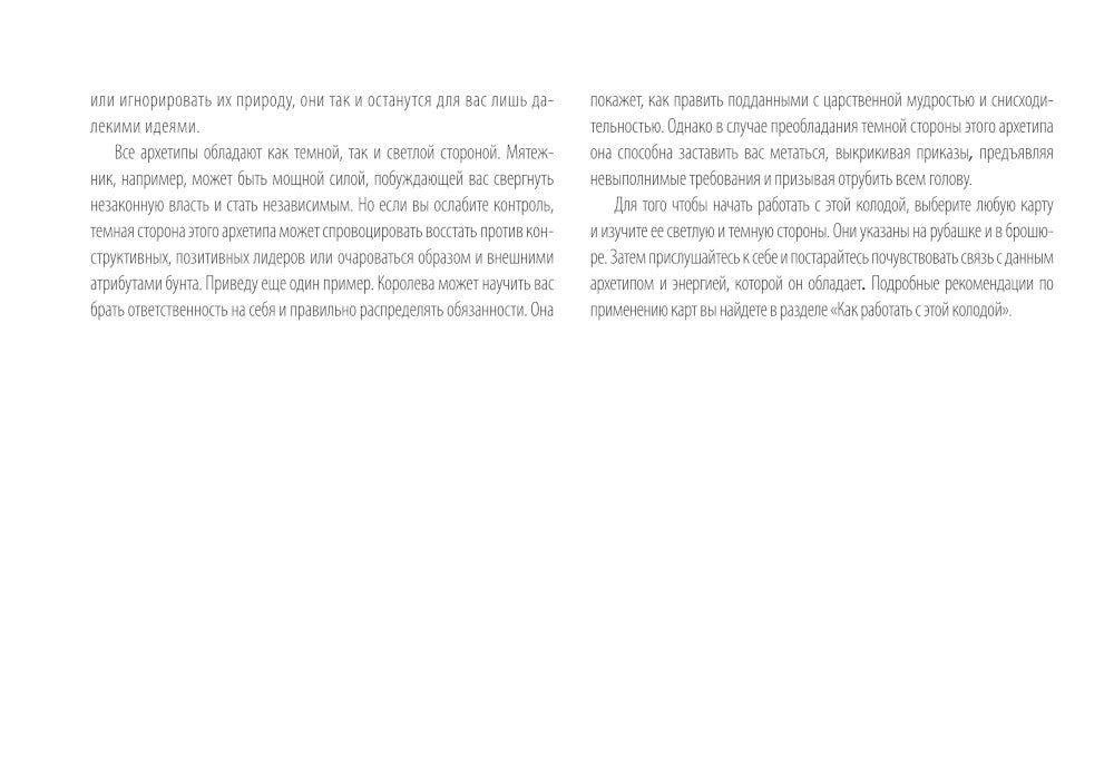 В ваших руках — уникальный набор из 74 карт-архетипов, раскрывающих темные и светлые стороны души человека. Архетипы — это древние универсальные модели поведения, обсуждение в основе коллективного бессознательного, о котором писал Карл Юнг. У каждого человека индивидуальный набор архетипов. Они — наши верные помощники, которые способны выручить даже в самых сложных и нестандартных установках. Вместе с колодой вы получите подробное руководство, которое подскажет, как пользоваться картами и обозначит основные архетипы. Такой глубинный анализ позволит лучше понять себя, а вместе с тем дать подсказку, как стать по-настоящему счастливым и успешным. Карты просты в одежде и подходят абсолютно каждому, кто хочет изучить свой внутренний мир. Автор Кэролайн Мисс — медиум, занимающийся энергетической медициной и познанием человеческого сознания. Она уделяет особое внимание оказанию помощи людям в связи с эмоциональными, психологическими и физическими причинами, из-за которых они находятся в условиях стационара или при заболеваниях. Многие ее книги стали бестселлерами по версии New York Times. Колода упакована в подарочную коробку. В комплект входят книги-руководства и 80 карт (74 карты-архетипа + 6 пустых).