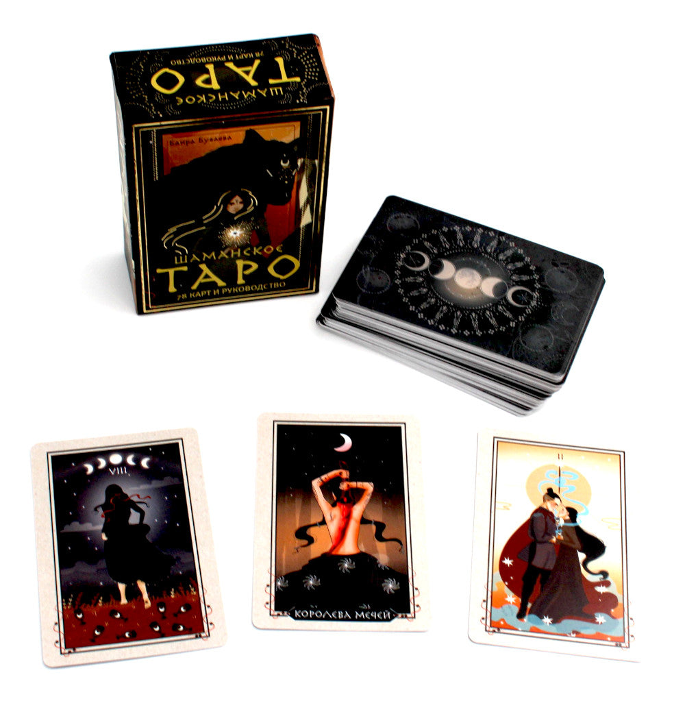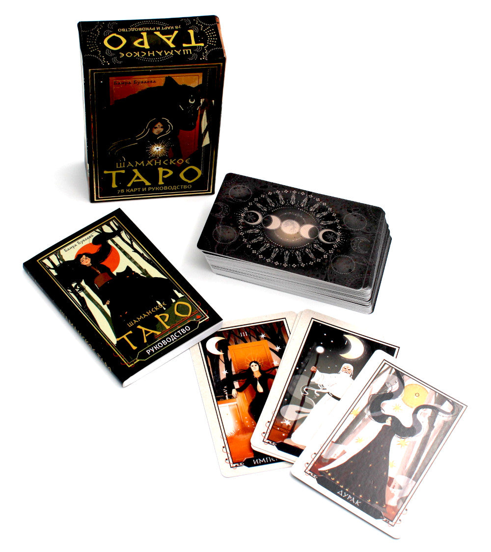 Колода карта «Шаманское Таро» сочетает в себе традиции и символизм классической колоды Райдера-Уэйта, калмыцкий шаманский фольклор и авторский стиль художницы Баиры Буваевой. Героями этой колоды стали шаманы и шаманки, духи волшебного леса и волки — хранители врат между реальным и потусторонним миром. В наборе 78 карт с авторскими иллюстрациями традиционных старших и младших арканов Райдера-Уэйта, руководство с расшифровкой всех карт и легенда о маленькой звезде. Исследуйте таинственный лес, встретите героев колоды и найдите ответы на все волнующие вопросы «Шаманского Таро»!