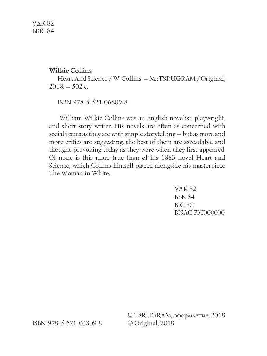 Уильям Уилки Коллинз — английский писатель, драматург и автор рассказов. Его романы часто затрагивают социальные проблемы в той же степени, что и простое повествование, но, как отмечают всё больше критиков, лучшие из них сегодня так же легко читаются и заставляют задуматься, как и в момент своего появления. Это особенно верно в отношении его романа 1883 года «Сердце и наука», который сам Коллинз поставил рядом со своим шедевром «Женщина в Вите».