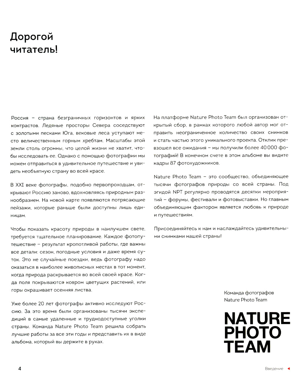 Откройте для себя Неповторимую Россию глазами представителей команды Nature Photo Team! Nature Photo Team — сообщество любителей природы, путешествий и фотографий. Организуют форумы, фестивали и фотовыставки. Издают фотоальбомы и публикуют полезные статьи для всех любителей фотографии. Команда создала десять признанных экспертов, популяризирующих путешествия и художественную фотосъемку. Природа нашей страны невероятно разнообразна: от живописных лесов средних полос до суровых просторов Ямалы, от диких Курильских островов до загадочных Чарских песков. Каждый уголок России уникален и по-своему удивлен. В этом альбоме команда фотографов команды Nature Photo собрала бесценную мозаику кадра, чтобы показать, насколько яркой может быть природа нашей страны, поделиться невероятными графиками самых труднодоступных мест, а также обратить внимание читателя на необычные сюжеты, которые каждый может увидеть в своей повседневной жизни. • Средняя полоса России: познакомьтесь поближе с таинственной природой лесов и их обитателей, поразитесь инопланетному многообразию подводного мира, взгляните на шедевры макросъемки и погрузитесь в чарующую атмосферу природы, которая веками вдохновляет художников и писателей. • Ямал: вдохновитесь невероятным северным сиянием, присмотритесь к очаровательным дарам сурового региона и проникните в глубокую таежную реальность. • Таганай: погрузитесь в сказочный мир Южного Урала, исследуйте суровые горные просторы и ощутите безмолвное величие заснеженных вершин. • Чарские пески: позвольте воображению перенести вас в другую вселенную, исследуйте контрасты природы, наблюдая за песками пустынных дюн и отражением ледяных рек. • Курильские острова: побывайте в самых труднодоступных местах нашей страны, познакомьтесь с устойчивыми колоритными обитателями островов, узнайте все о дикой и экзотической природе Курил. • Колымский край: проезд для себя исключительных диких просторов с окончательными горными реками, лиственничными деревьями и таинственной атмосферой. • Хибины: насладитесь кристально чистыми формами, ощутите дух приключений и навсегда влюбитесь в великолепные горные и лесные пейзажи. Этот альбом — способ преодолеть тысячи километров дорог и увидеть истинную Россию, во всем ее многообразии. Великолепные фотографии от профессионалов своего дела, выполненные на высококачественной бумаге, стильное оформление и крупный формат делают книгу настоящим произведением искусства и ценным подарком.