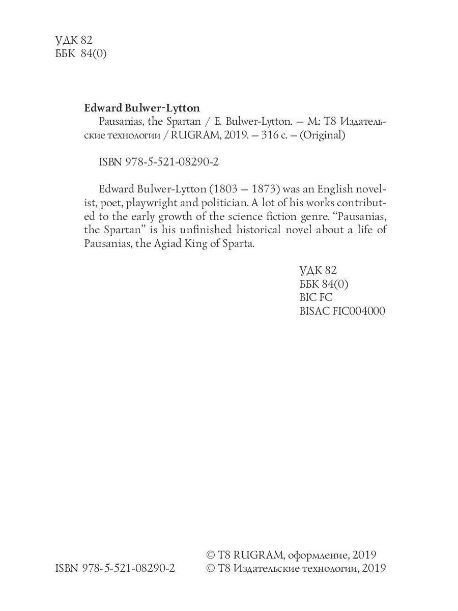 Эдвард Бульвер-Литтон (1803–1873) — английский писатель, поэт, драматург и политик. Многие его произведения способствовали раннему развитию жанра научной фантастики. «Павсаний, спартанец» — его незаконченный исторический роман о жизни Павсания, царя Агиадов в Спарте.