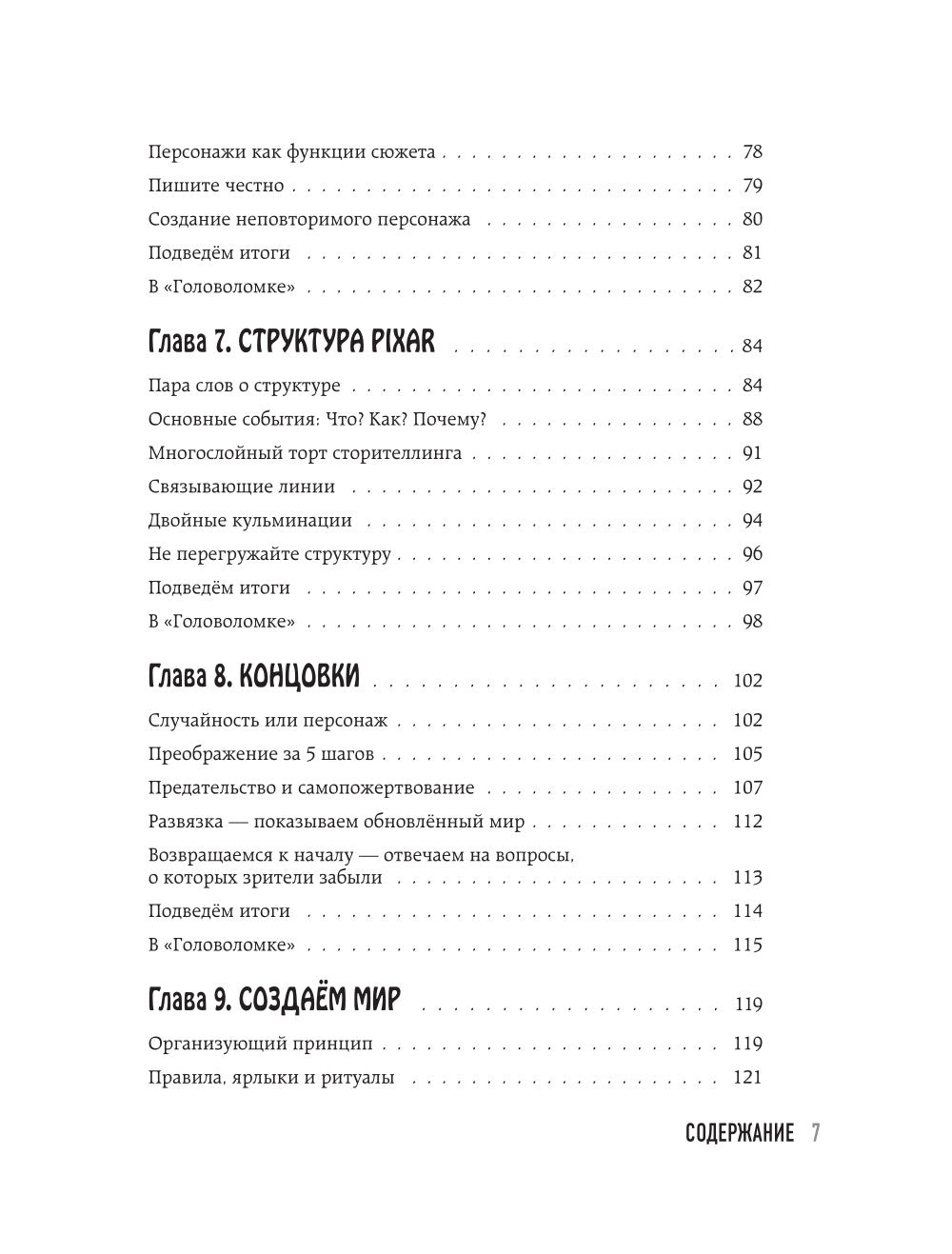 10 глав — 10 советов, каждый из которых аргументируется на основе уже существующих анимационных фильмов компании. Будет интересен начинающим писателям и сценаристам, которые хотят изучать историю, а также героям мультфильмов Pixar, которым интересно узнать больше о создании своих любимых историй. В обновленном дополненном издании автор добавил книги разбора новинок студии, таких как «История игрушек 4», «Вперед», «Душа», «Баз Лайтер» и «Элементарно»!