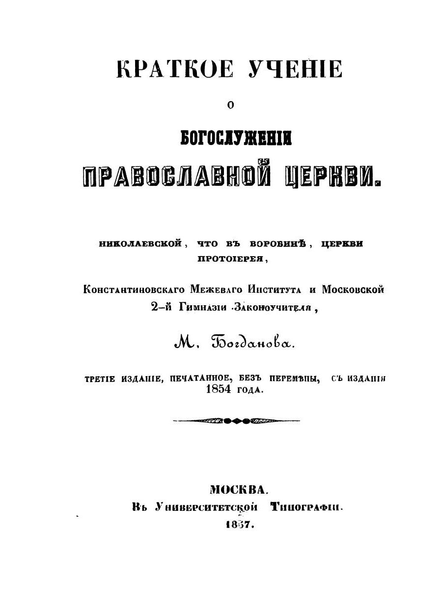 Богданов Михаил Григорьевич ( –1860) — протоиерей; долгое время был законоучителем 2-й Московской гимназии и определения на священническое место в Московской Церкви Николая. За свои годы Михаил Григорьевич издал несколько учебников по Закону Божию, в том числе и данного труда, в котором подробно и достоверно рассказал о разных видах церковного богослужения. Воспроизведено в оригинальной авторской орфографии издания 1857 года (М. : Унив. тип., 1857. — 78 с.).