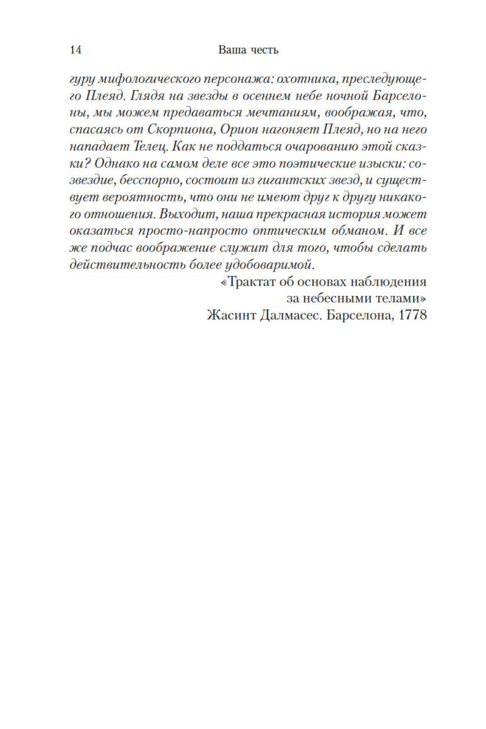 Роман выдающегося каталонского писателя Жауме Кабре «Ваша честь» (1991) был создан задолго до его знаменитого «Я исповедуюсь». Но уже тогда автор волновал тему сильного мира сего, мировой коррупции и абсолютной власти, для которой существует лишь право сильного. Зима 1799 года. В Барселоне не прекращаются дожди, город кажется парализованным, и тем не менее, светская жизнь в самом разгаре. Кажется, аристократов лишь заботит то, как отпраздновать наступление нового года, девятнадцатого века. В кафедральном соборе исполняет Te Deum, а в роскошных залах разворачивается череда светских приемов... Но праздничная атмосфера омрачает странное убийство французских певиц. Арестован молодой поэт, случайно оказавшийся «не в то время не в том месте». Он безоговорочно признан виновным, тем более что у него обнаружены документы, которые могут привести к падению «вашей чести», — дона Рафеля Массо, председатель Верховного суда. Известно, что у этого человека, наделенного властью казнить или миловать, есть одна слабость: он обожает красивых женщин. Так что же перевесит: справедливость или власть, палач или жертва, «Я ее не убивал!» один или «Я этого не хотел» другого?