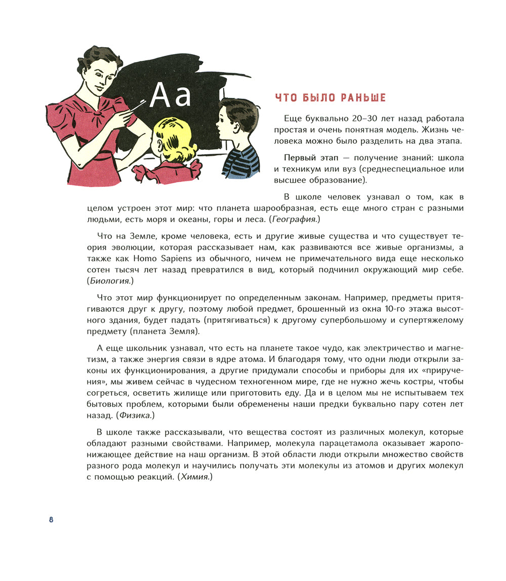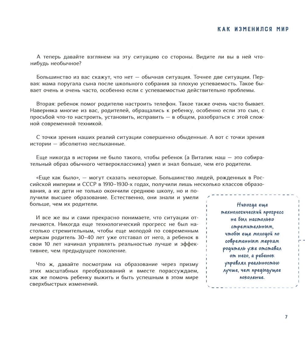 Быть успешным в современном мире — совсем не то же самое, что 300 лет назад. Мир меняется значительно быстрее, чем мы видим. Профессии труда и исчезают одна за другой. Поэтому у мыслящего родителя возникает вопрос: как подготовить ребенка к будущему? Каким навыкам и навыкам он научился через десять лет и чему его учить уже сегодня? Исходя из современных реалий, автор изучает навыки, которые будут актуальны в будущем, и дает практические навыки в их обучении. В этой книге собраны основные приемы, методы и принципы эффективного обучения. Они упрощают процесс обучения, но помогают получить более полные и структурные знания по школьным предметам, тратя на это меньше времени. Книга составлена ​​для родителей школьников и детей старше дошкольного возраста.