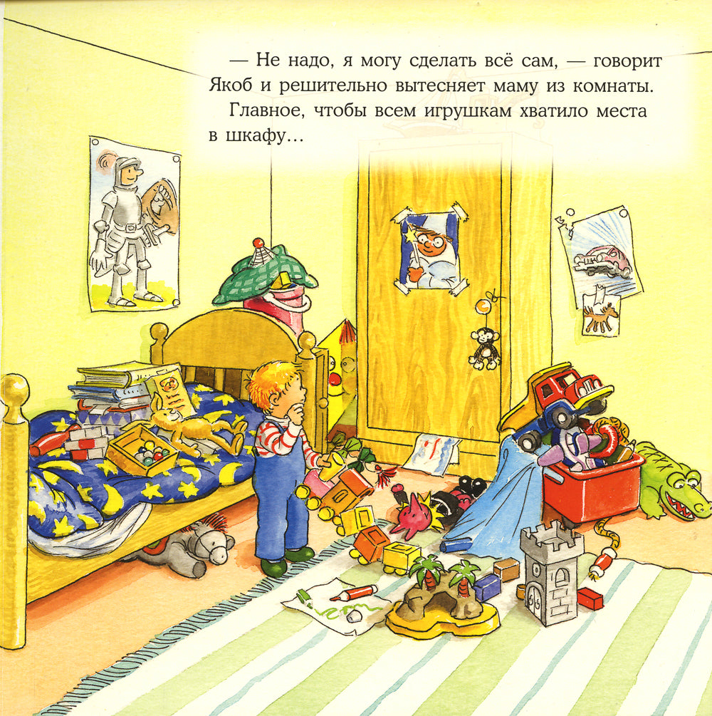 Якоб считает, что он уже большой и может делать все сам: и порядок в комнате навести, и завтрак себе сделать, и даже вместо мамы купить все необходимое в магазине. Правда, сказку на ночь лучше родителей рассказать не получится. Эта история самостоятельности поможет вашему малышу обрести силы и стать более решительными, а вы, родители, помните, что в этот период очень важно поддерживать и вдохновлять детей во всех их делах.