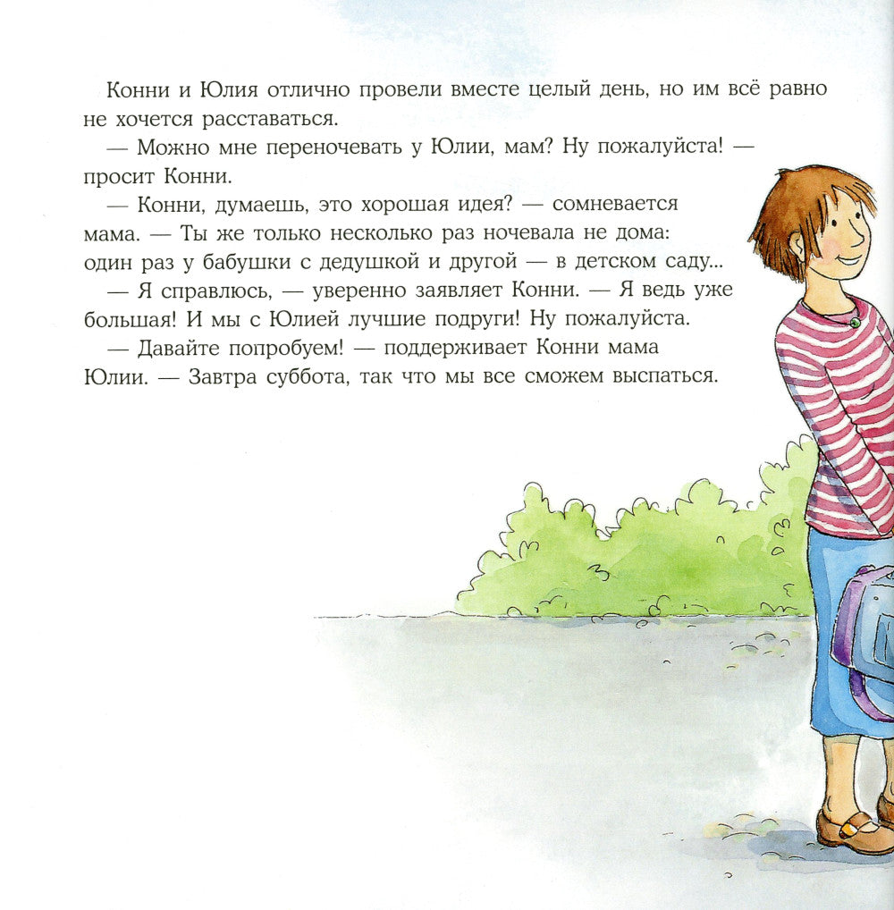 Ночёвка у лучшей подруги — это здорово! Можно долго играть, смотреть телевизор и лечь спать позже обычного. Но такое, пусть и приятное, приключение требует подготовки. Вместе с Конни ваш вывод приводит список того, что ему обязательно надо взять для ночёвки у друзей, и вы сможете обсудить, как ему лучше поступить, если что-то в гостях окажется непривычно или непонятно.