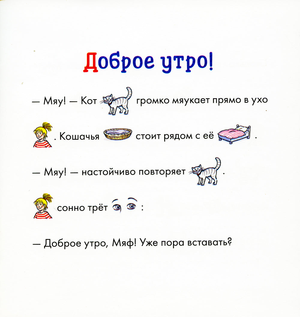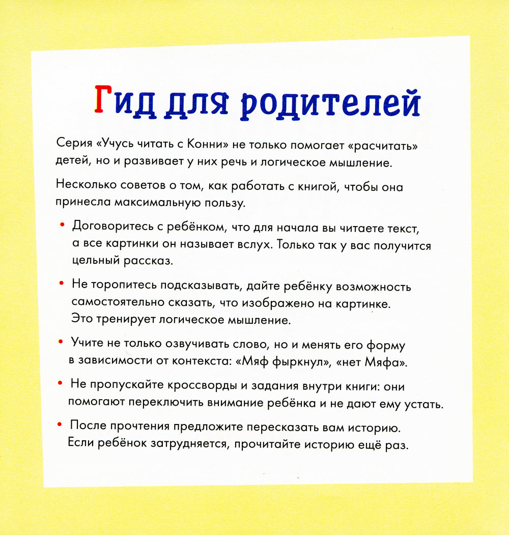 Давайте расчитываться вместе с Конни! Короткий текст, простой, но увлекательный сюжет, приятные картинки и дополнительные задания помогут удержать внимание даже начинающему читателю. Сегодня утром Конни проспала и чуть не опоздала в школу. У нее не было ни времени, ни сил приласкать Мяфа. А по возвращении выяснилось, что кот домой-то пропал... По этой книге можно заниматься и с теми детьми, которые уже знают алфавит и умеют читать, но не хотят этого делать, и с теми, кто только начинает знакомиться с печатными текстами.