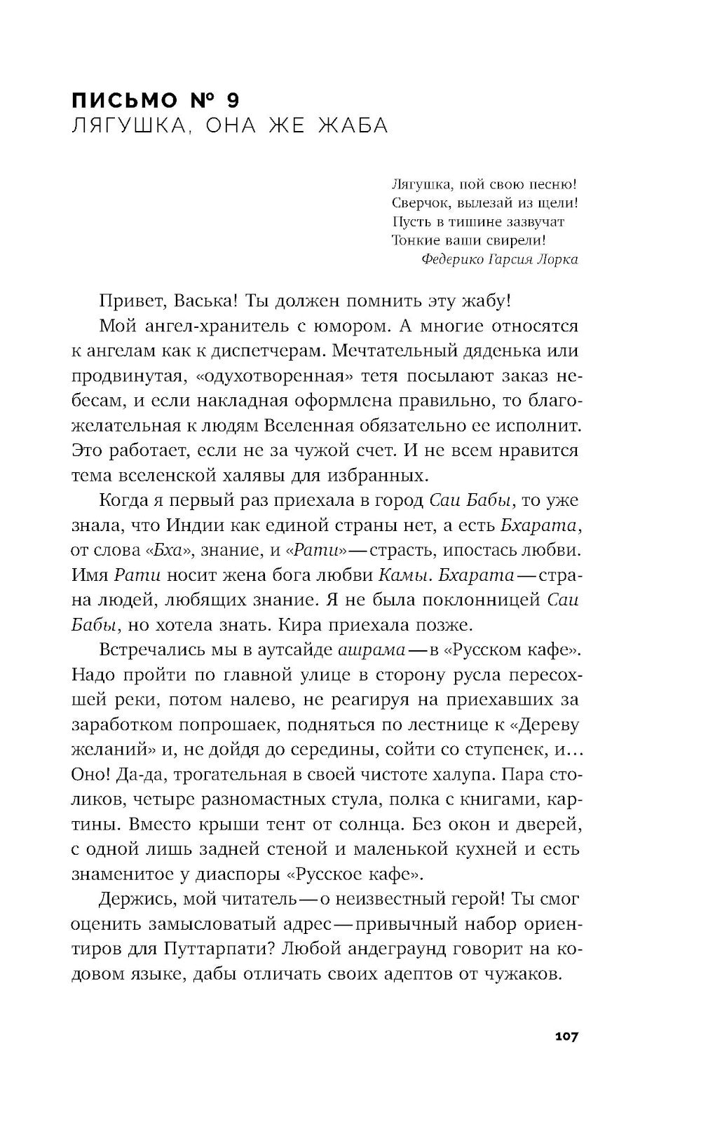 Что будет, если женщина, очарованная идеалами хипповской молодости, замученная постсоветской нищетой, не умеющая строить отношения с мужчинами, желающая «немного денег и передохнуть когда-нибудь, и еще чтобы близкие были счастливы» — и отправится челноком в Индию? В иронической травелоге-эпистолярии Ирины Васильевой история безответной любви к далекому (а в самом деле — столь близкому) человеку складывается на классическое паломничество европейца в стране Востока. Склонная к авантюризму героиня Васильевой окунается в нижней гущу представителей районов Дели, Мумбаи и других городов, которые означают без иллюзий и прикрас, и в конце концов оказываются хозяйкой этнического магазина и женой кришнаитой. Стремясь открыть terra incognita, она постепенно обретает новый способ существования, который коренным образом меняет ее идентичность и испытывает социальную и духовную жизнь. Ирина Васильева — искусствовед, специалист по индийскому искусству, профессиональный гид по Индии.