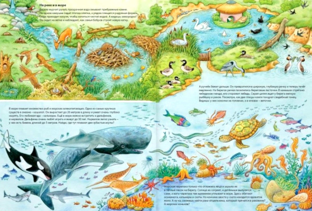 Сколько удивительных животных в этом мире! В лесу, на лугу, у реки, в глубинах морей и океанов, в жарких тропических лесах и саваннах, среди бескрайних полей – везде кипит жизнь! Рассмотрите внимательно красочные, полные занятые детали страницы этой виммельбуха. В нем спряталось более 350 разных животных из всех уголков нашей планеты!