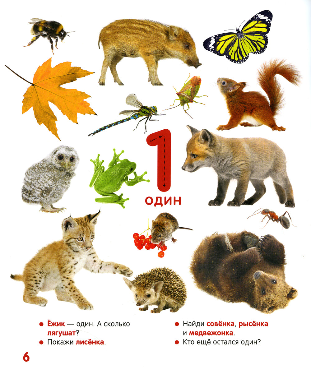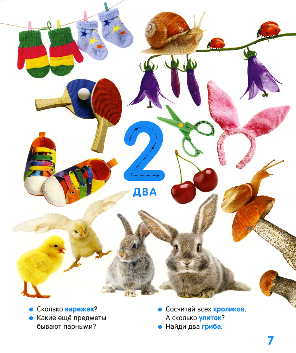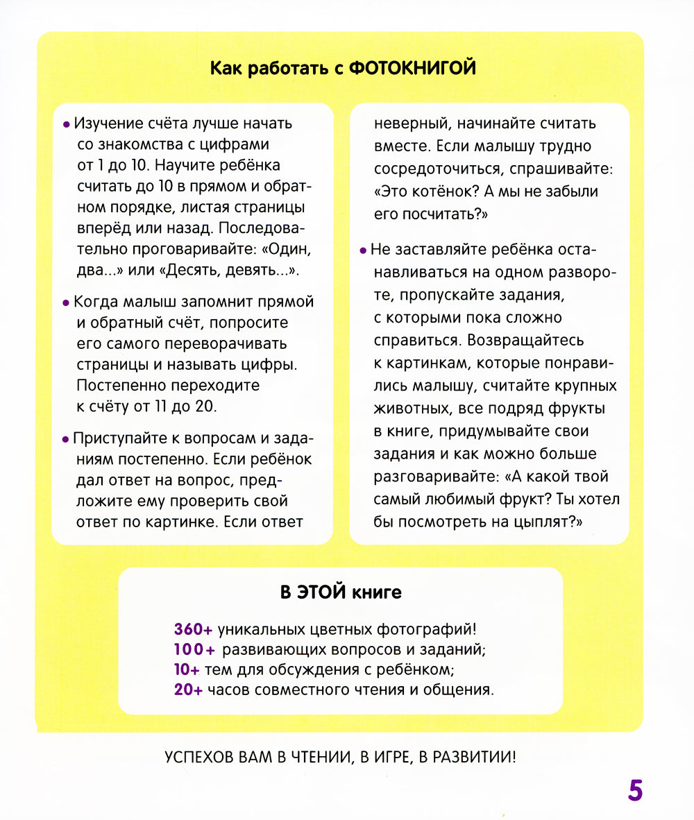 Эта фотокнига станет для малыша первым знакомством с цифрами и счетом. Его ждут очень крупные яркие цифры, по которым можно и нужно вести пальчик, чтобы научиться писать их самостоятельно, понятные и нескучные вопросы и задания, множество разноцветных фотографий животных и птиц, овощей и фруктов, машинок и самолетов и всего-всего, что интересно считать!