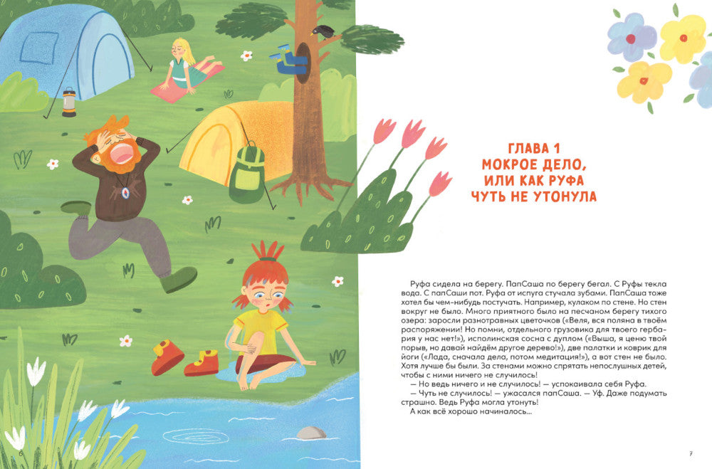 Новые приключения пятерых ребят и их папы на природе! В этот раз действие истории происходит вокруг водоема — лесного озера, стоящего у которого стала эта точка в путешествии компании... История начинается с того, что команда пассажиров решает разбить лагерь на берегу лесного озера. Пока мальчики берут палатку, девочки отправляются за ручью с водой на обед. И каков же соблазн хоть ненадолго окунуться в прохладную воду! Леля, Руфа и Лада решили, что немного освежиться им не повредит, начинается радостно плескаться, как вдруг... начинает тонуть! Хорошо, что папа Ваня решил помочь девочкам и оказался рядом! Он вытащил незадачливую пловчиху и, переполняемый целой гаммой противоречивых чувств, вместе с папойСашей рассказал ребятам о том, как правильно себя вести на воде, чтобы не случилось беды. Вместе с героями об этом узнают и читатели А еще учатся: почему нельзя пить воду из озера, как разжечь костер, даже если вокруг все мокрое от дождя, в чем секрет успешной рыбалки и поймут, как важно слушать взрослых, оставаться над природой. Книга содержит специальные разделы для родителей — «Разговор с тьютором», а также интерактивные развороты: как соединить узлы, какая рыба водится в пресной воде и так далее.