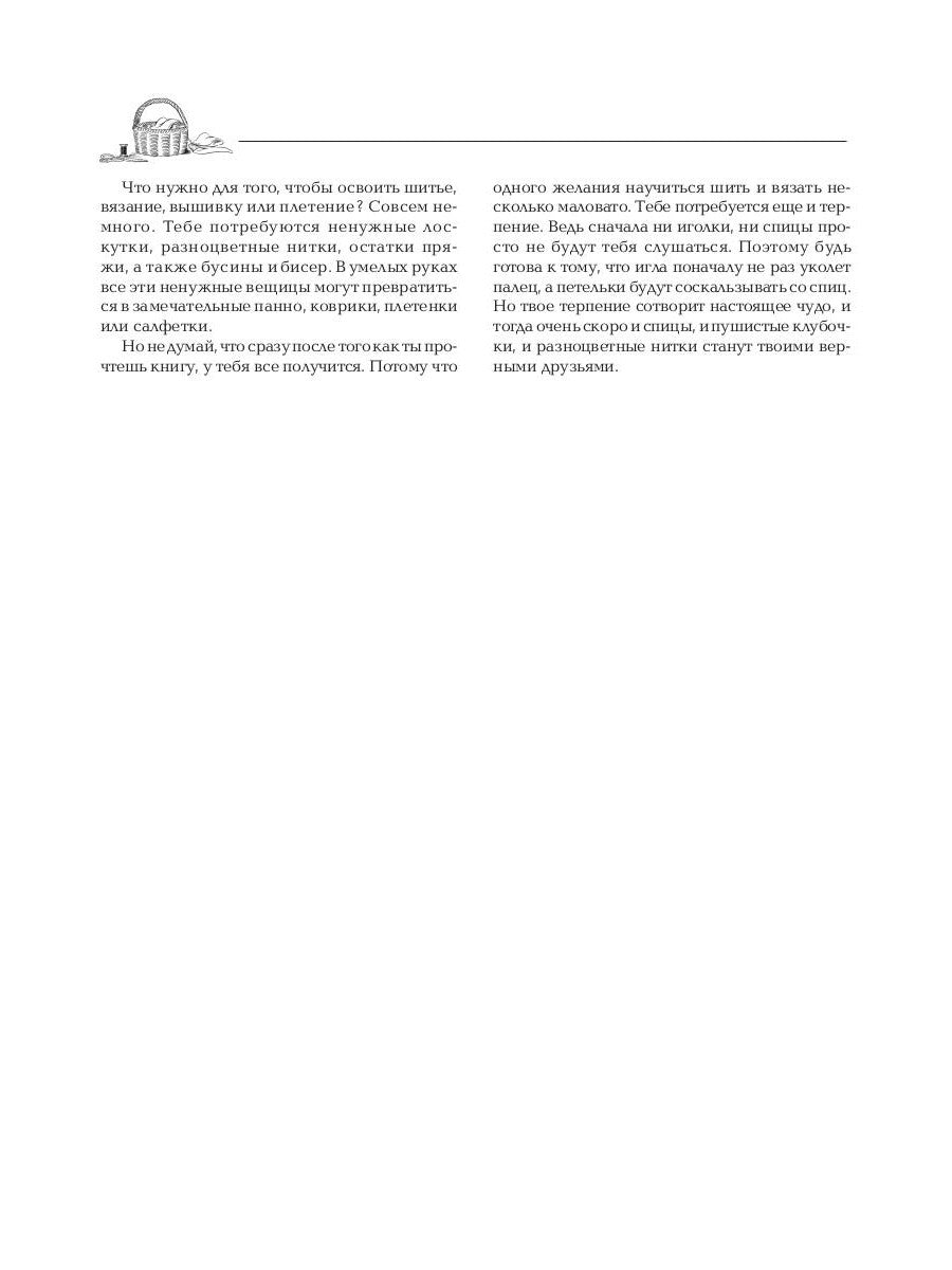 На страницах книги «Волшебная корзинка для рукоделия», ты, наша юная читательница, найдешь очень много нужных и полезных советов, которые не раз тебе помогут. «Волшебная корзинка» ненавязчиво научит тебя рукодельному искусству. Ты научишься шить одежду не только для своих куколок, но и для себя, вязать крючком ажурные салфетки, спицами — теплые варежки. Книга подскажет вам, как можно научиться вышивать бисером, плести модные фенечки, делать настенные кашпо для цветов. Кроме того, в книге вы найдете сведения о технологиях пошива прихваток, фартучков и панно. А мы обещаем тебе, что обучение будет легким и очень увлекательным.