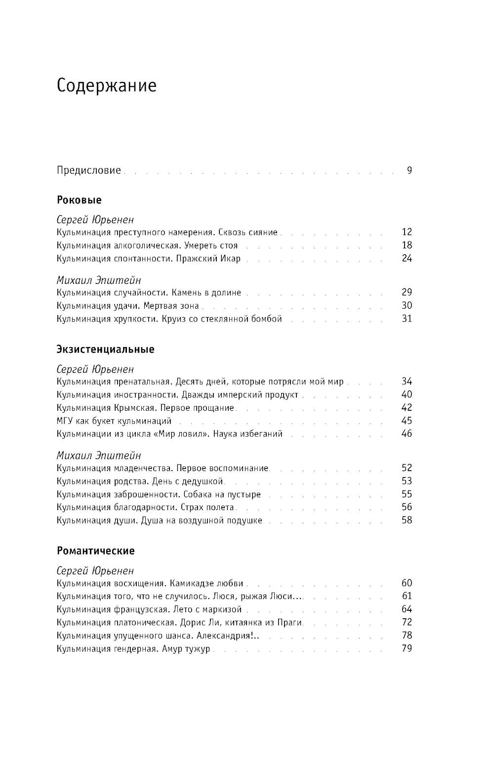 Эта книга — о высших точках опыта, «кульминациях», когда почти мгновенно постигаешь себя, общество, человеческую природу, явленную на гранях, на сломах. Михаил Эпштейн и Сергей Юрьенен — друзья с молодостью — задумываются о поворотных моментах своей жизни и постепенном развитии тяжелых переживаний. В книге вошло около девяноста небольшие истории на разные темы — любовно-романтические и семейные досоциальные, в частности и творческие. Кульминации, о которых пишут авторы, приводят к крещению духовных сюжетов с событиями большой истории и общечеловеческими духовными проблемами, которые внезапно получают окончательное воплощение в пережитых ими экстремальных установках. Рассказчики надеются, что эта книга по острому самоанализу поможет читателям лучше осознать кульминационные моменты собственной жизни. Михаил Эпштейн — философ, культуролог и литературовед, лингвист, эссеист. Автор книг «Ирония идеала» и «Проектный словарь гуманитарных наук», вышедших в издательстве «НЛО». Сергей Юрьенен — прозаик, переводчик, журналист, издатель, автор публикаций в журнале «Новое литературное обозрение».